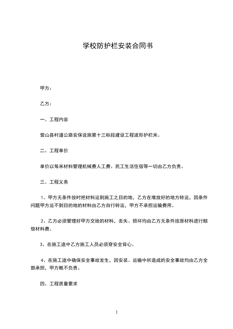 甲方支付乙方定金______元人民币,其余工程款在防护栏安装完成后一遍结清。