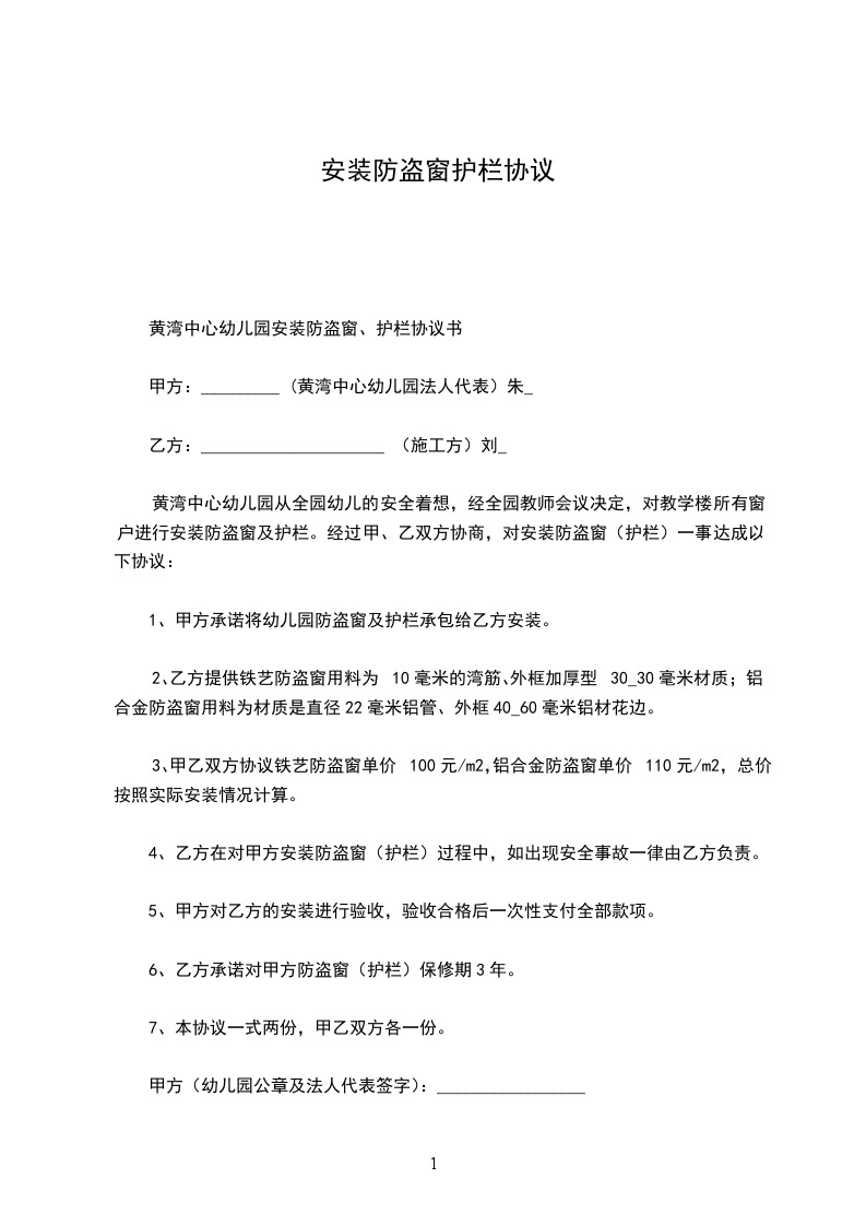 乙方承担全部防护栏用料以及负责防护栏安装实施,甲方指定用料为_______,厚度为________厚。定价安装每平米______元计算,总价根据具体实施面积以及相应折扣方法计算。
