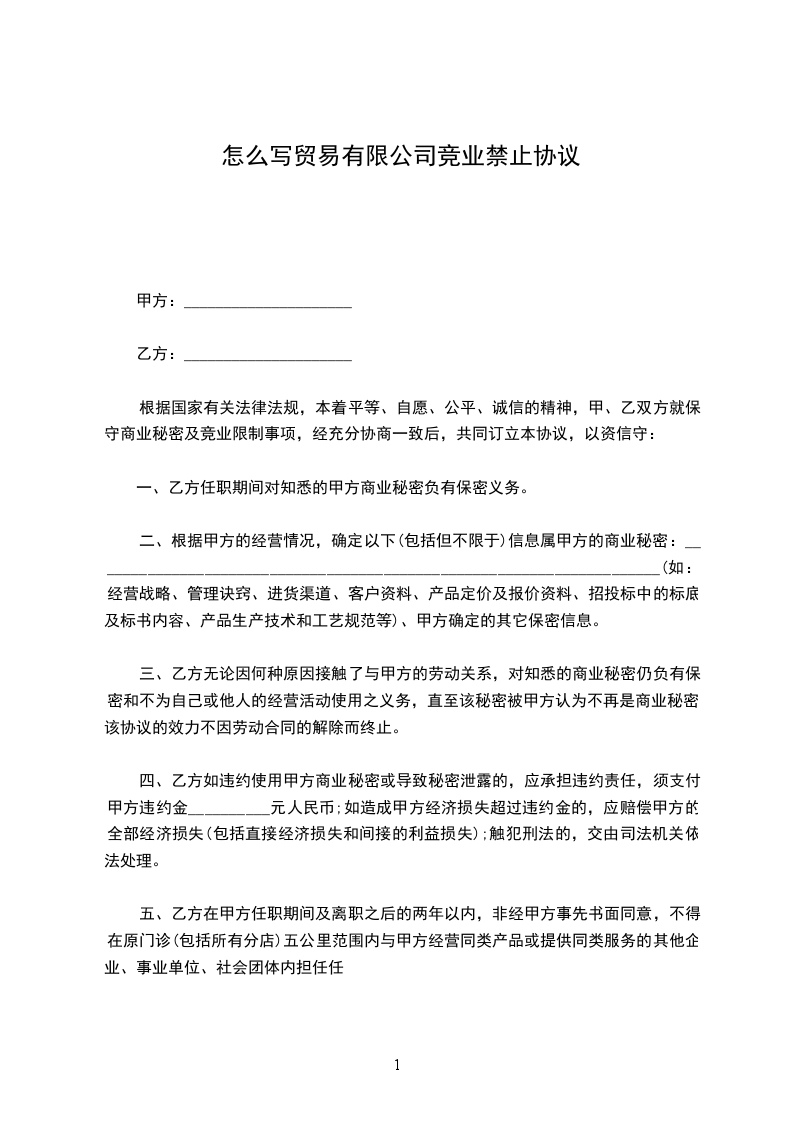 1、乙方在甲方工作期间及乙方从甲方离职之日起___________年内,乙方不得在与甲方及甲方关联公司有竞争关系的单位内任职或以任何方式为其服务,也不得自己生产、经营与甲方及甲方关联公司有竞争关系的同类产品或业务。