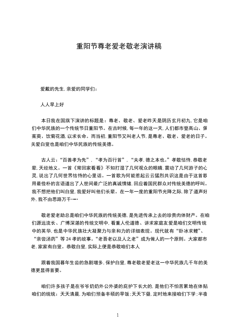 本日我在国旗下演讲的标题是:尊老、敬老、爱老昨天是阴历玄月初九,它是咱们中华民族的一个传统节日重阳节。在古时候,每一年的这一天,人们都市登高山、佩茱萸、饮菊花酒,以求长命。而当初,重阳节又叫老人节,是尊老、敬老、爱老的日子。关爱白叟也是咱们中华民族的传统美德。