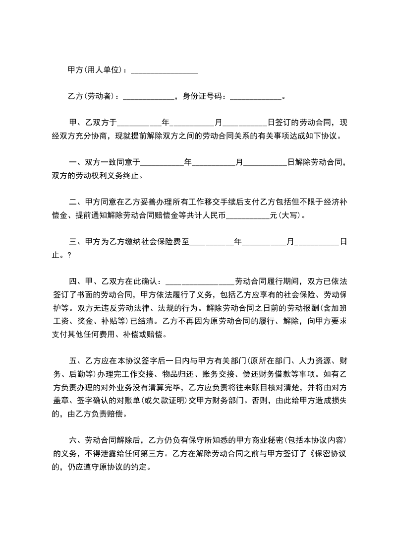 甲、乙双方于___________年___________月___________日签订的劳动合同,现经双方充分协商,现就提前解除双方之间的劳动合同关系的有关事项达成如下协议。
