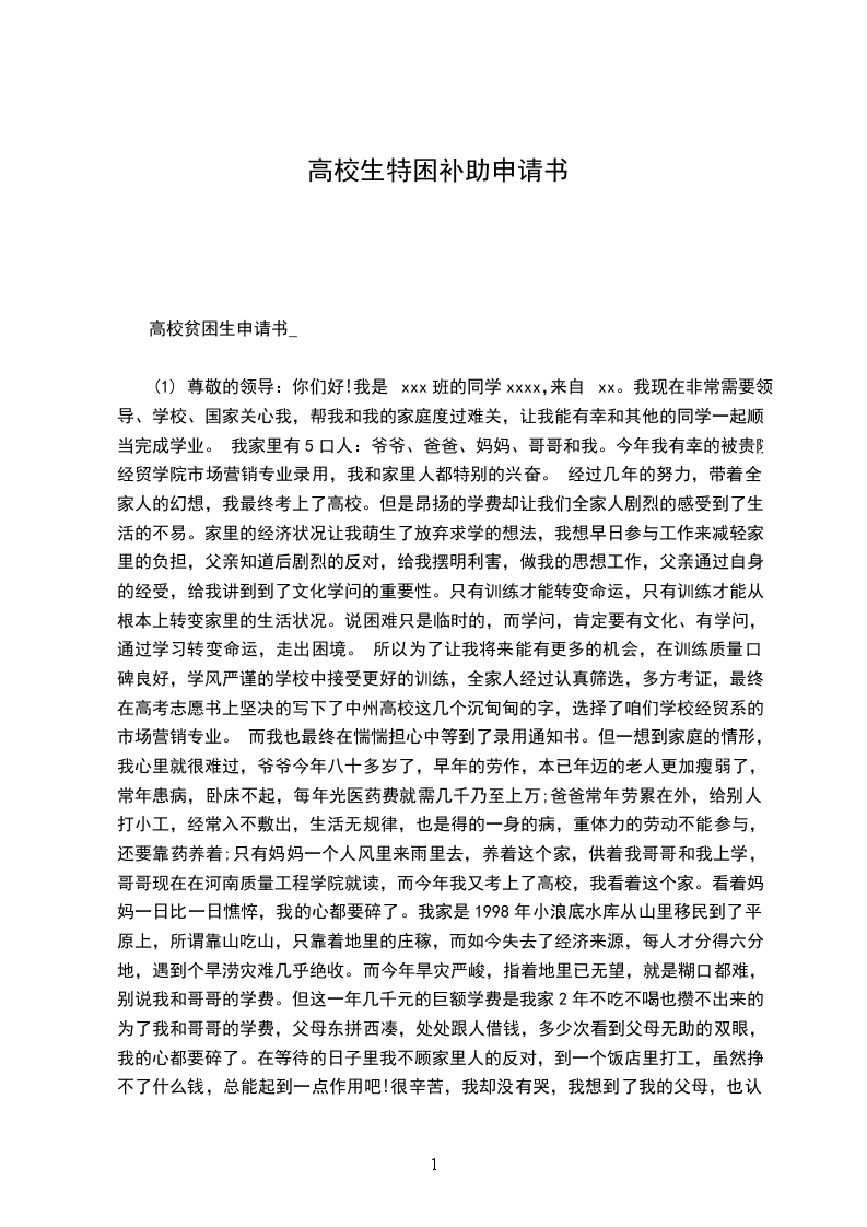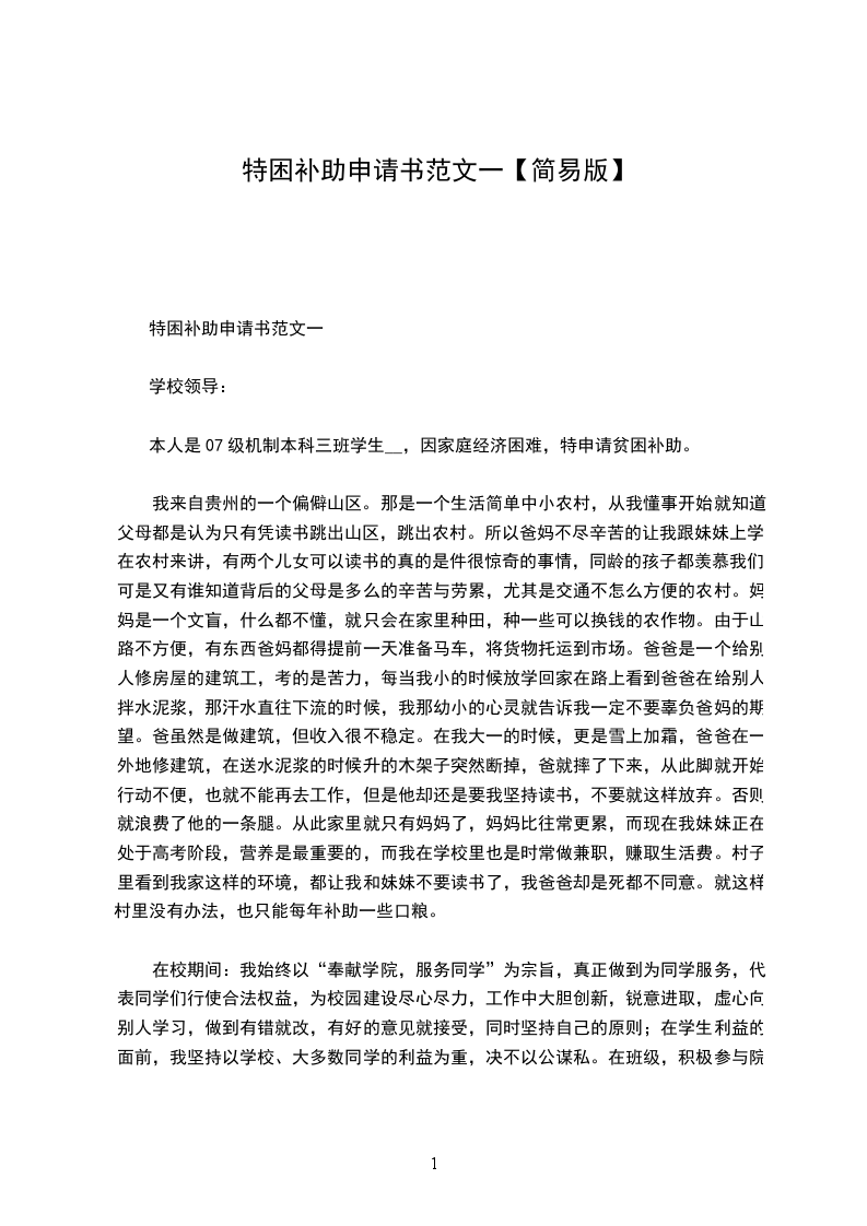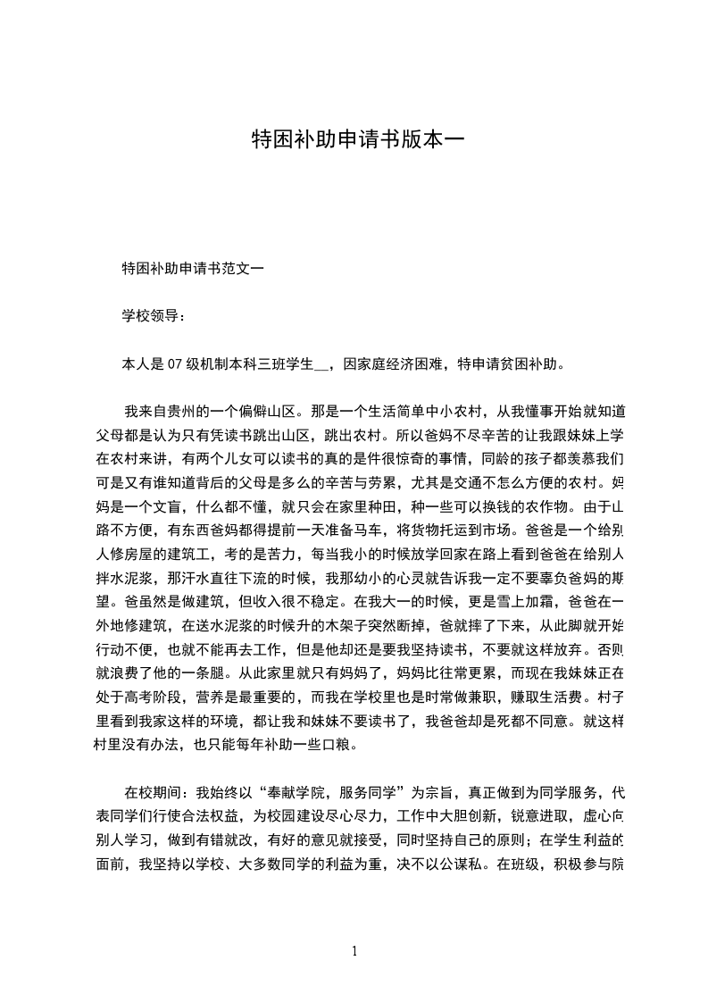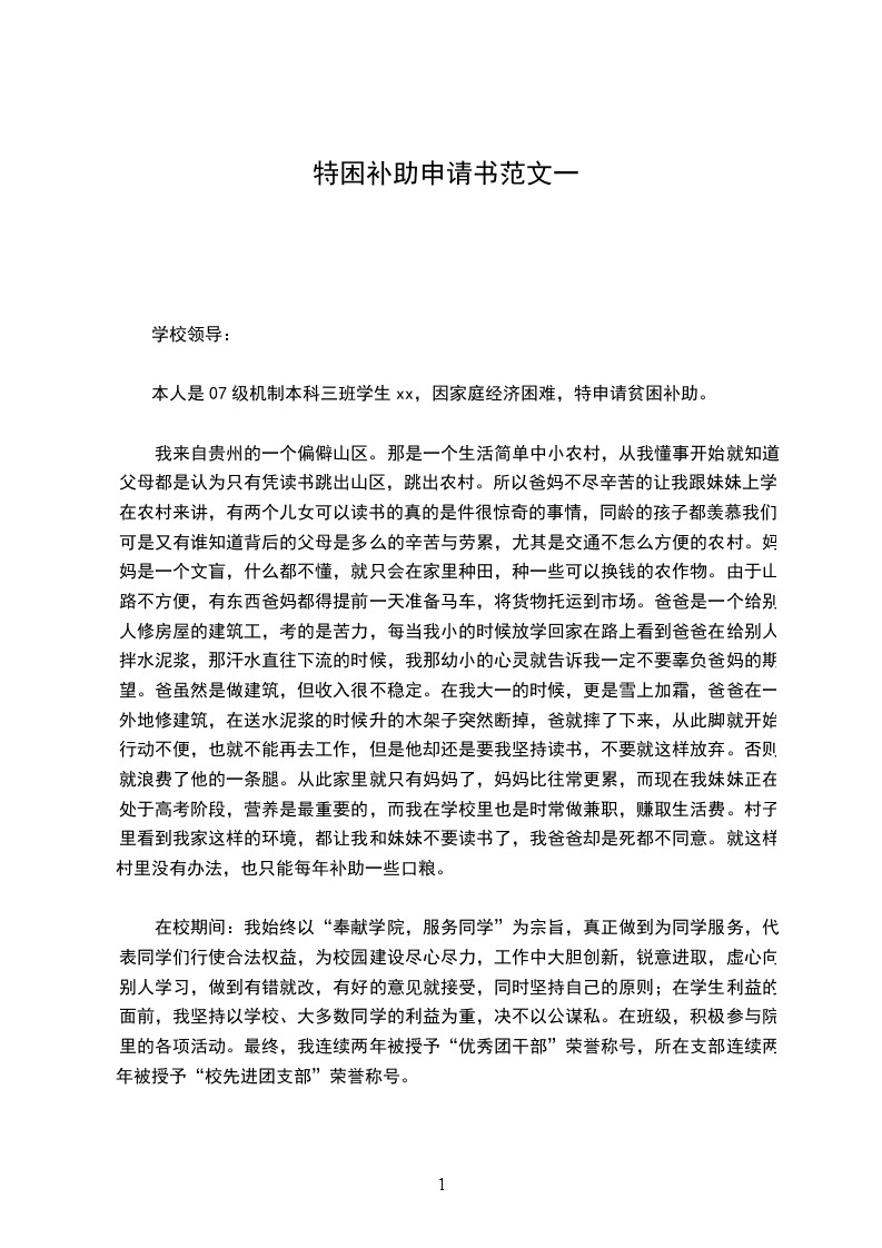 本人是07级机制本科三班学生xx,因家庭经济困难,特申请贫困补助。