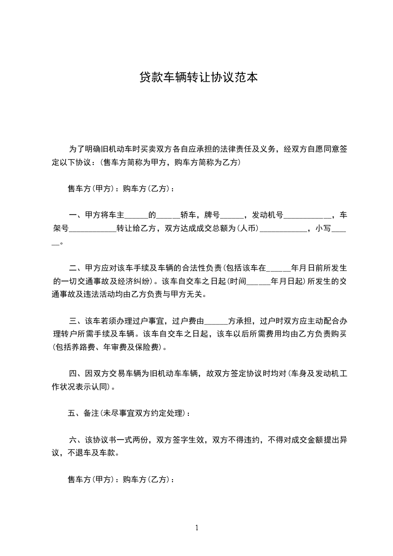 一、甲方将车主______的______轿车,牌号______,发动机号____________,车架号____________转让给乙方,双方达成成交总额为(人币)____________,小写______。