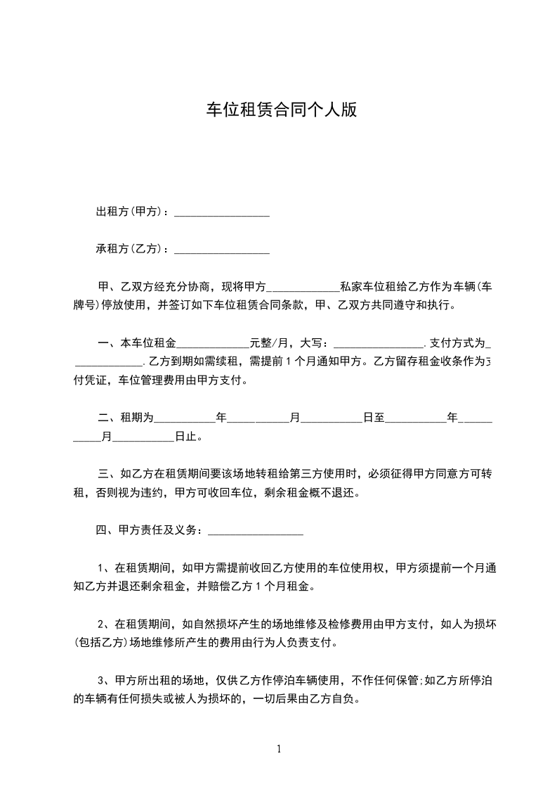 一、本车位租金_____________元整/月,大写:________________.支付方式为_____________.乙方到期如需续租,需提前1个月通知甲方。乙方留存租金收条作为支付凭证,车位管理费用由甲方支付。