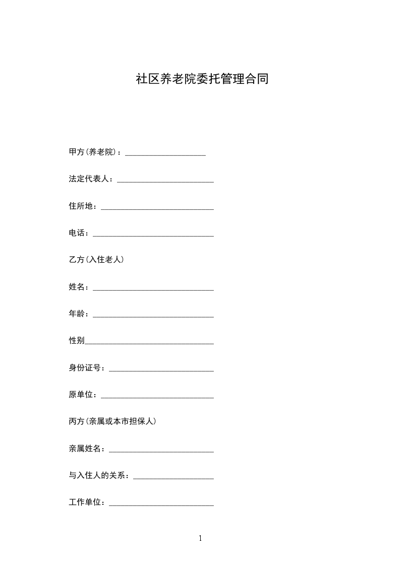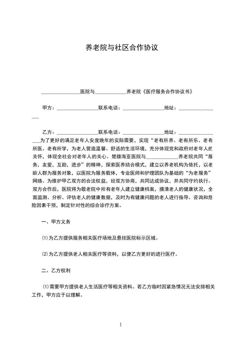 乙方:_________________联系电话:_________________地址:_________________为了更好的满足老年人安度晚年的实际需要,实现“老有所养、老有所乐、老有所医、老有所学,为老人营造温馨、舒适的生活环境,充分体现党和政府对老年人的关怀,体现全社会对老年人的关心。楚雄海亚医院与_____________养老院共同“服务,友爱,互助,进步”的精神,探索医养结合模式,建立以养老机构为依托,以老龄人群为服务对象,以医院为服务载体,专业医师和护理团队为基础的“为老服务”网络。为维护甲乙双方的合法权益,经双方协商,共同达成协议,并共同守约执行。双方合作后,医院将为敬老院中所有老年人建立健康档案,摸清老人的健康状况,全面监测、分析、评估老人的健康数据,及时为有健康问题的老人进行指导、咨询和危险因素干预,制定针对性的综合诊疗方案。