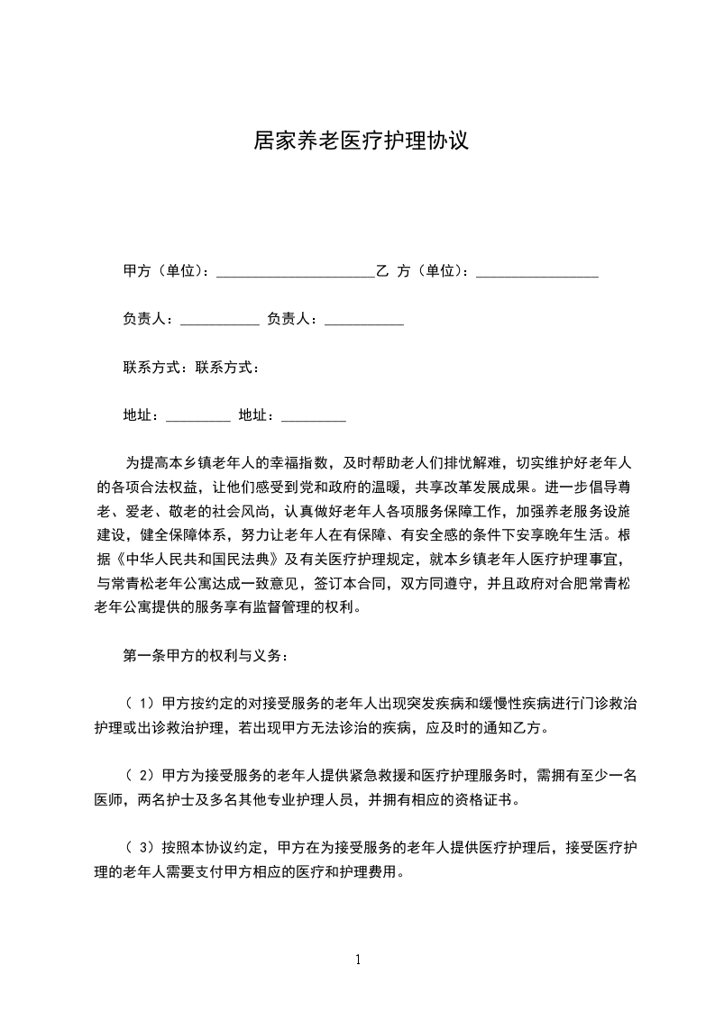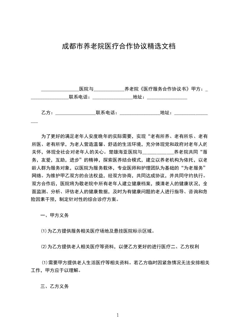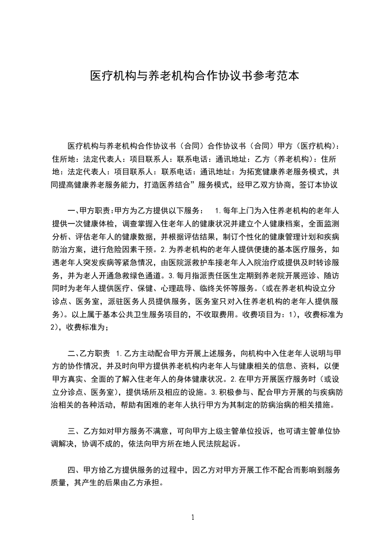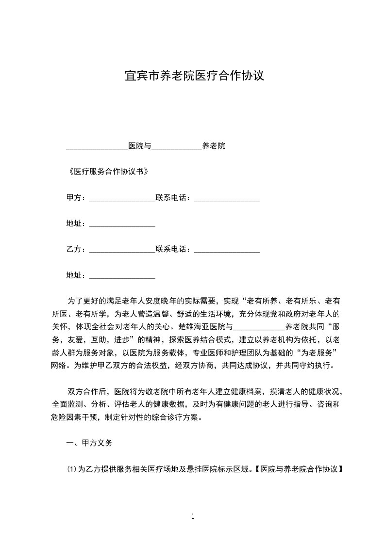 为了更好的满足老年人安度晚年的实际需要,实现“老有所养、老有所乐、老有所医、老有所学,为老人营造温馨、舒适的生活环境,充分体现党和政府对老年人的关怀,体现全社会对老年人的关心。楚雄海亚医院与_____________养老院共同“服务,友爱,互助,进步”的精神,探索医养结合模式,建立以养老机构为依托,以老龄人群为服务对象,以医院为服务载体,专业医师和护理团队为基础的“为老服务”网络。为维护甲乙双方的合法权益,经双方协商,共同达成协议,并共同守约执行。