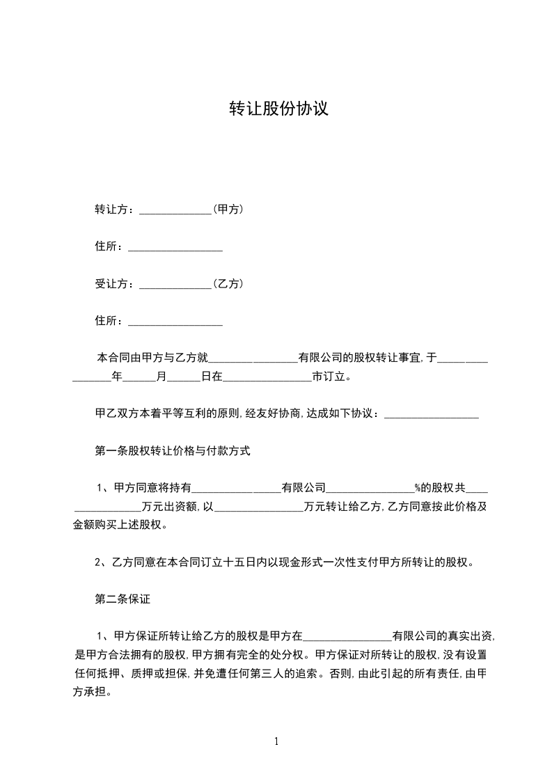 1、甲方同意将持有________________有限公司________________%的股权共________________万元出资额,以________________万元转让给乙方,乙方同意按此价格及金额购买上述股权。