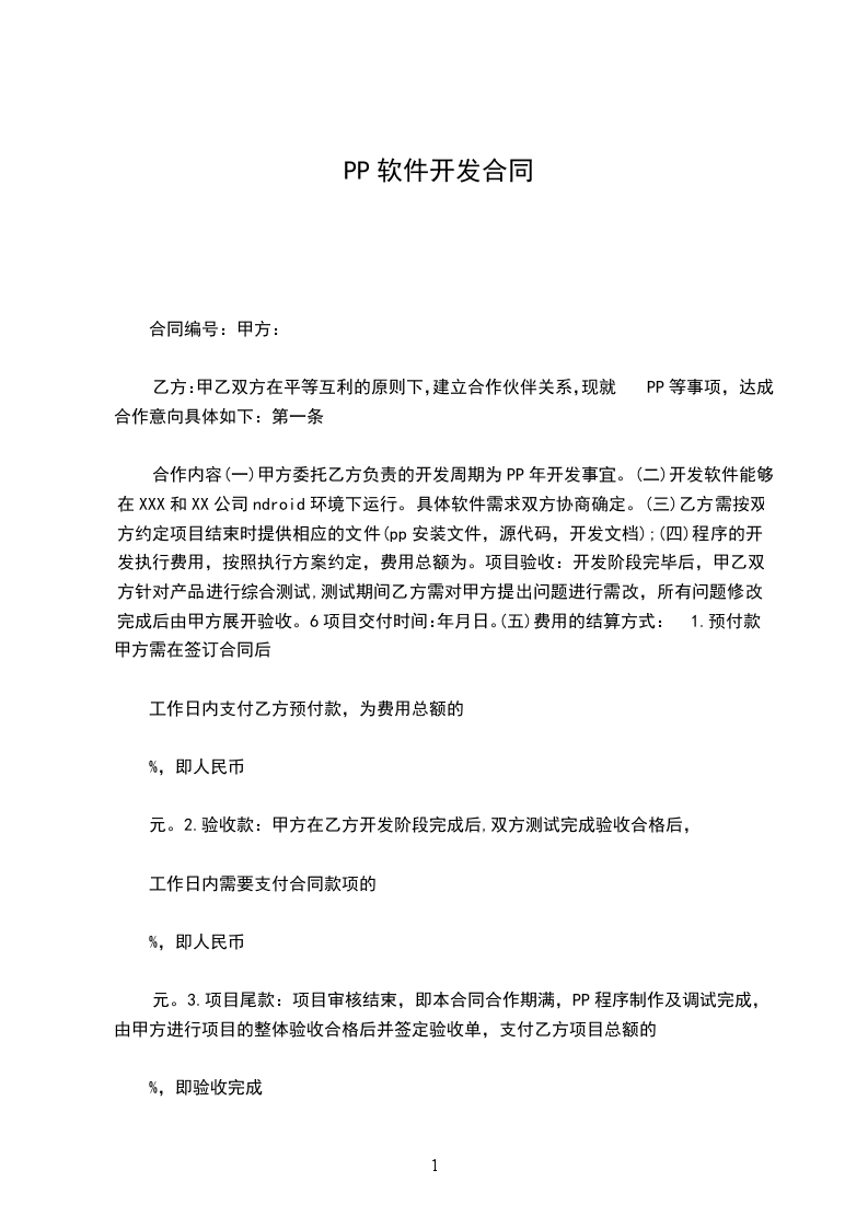 合作内容(一)甲方委托乙方负责的开发周期为PP年开发事宜。(二)开发软件能够在XXX和XX公司ndroid环境下运行。具体软件需求双方协商确定。(三)乙方需按双方约定项目结束时提供相应的文件(pp安装文件,源代码,开发文档);(四)程序的开发执行费用,按照执行方案约定,费用总额为。项目验收:开发阶段完毕后,甲乙双方针对产品进行综合测试,测试期间乙方需对甲方提出问题进行需改,所有问题修改完成后由甲方展开验收。6项目交付时间:年月日。(五)费用的结算方式:1.预付款:甲方需在签订合同后