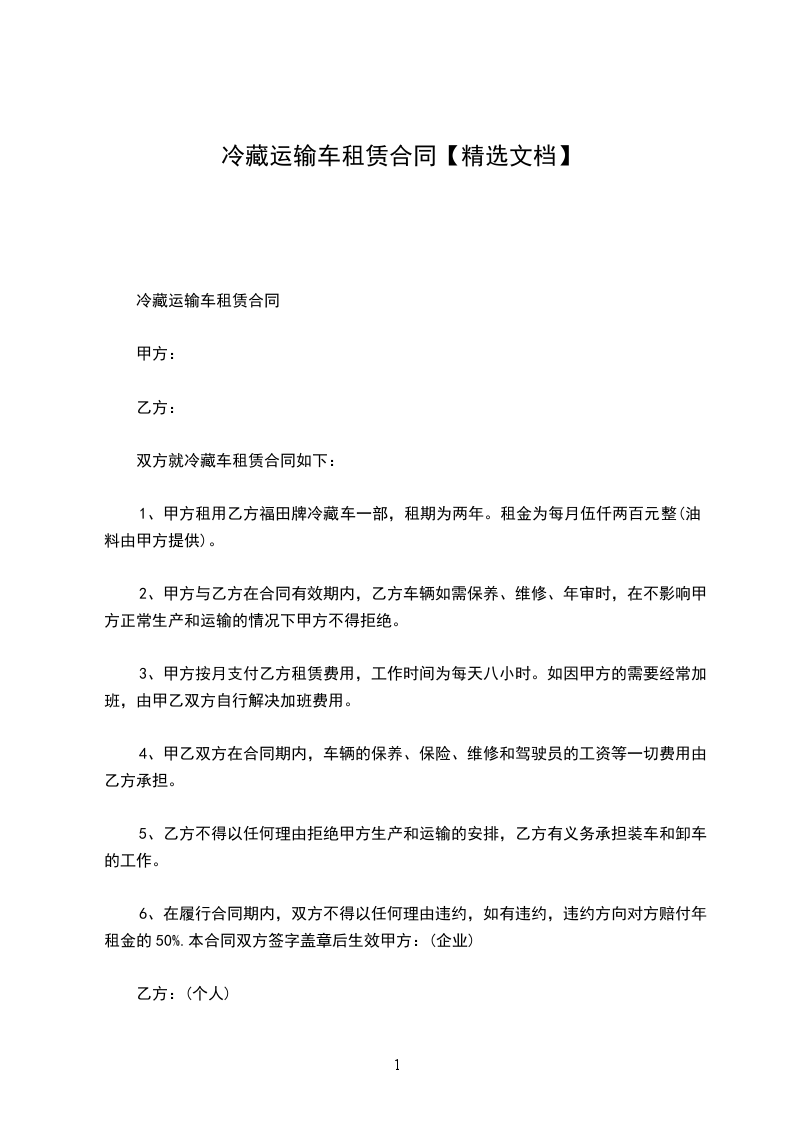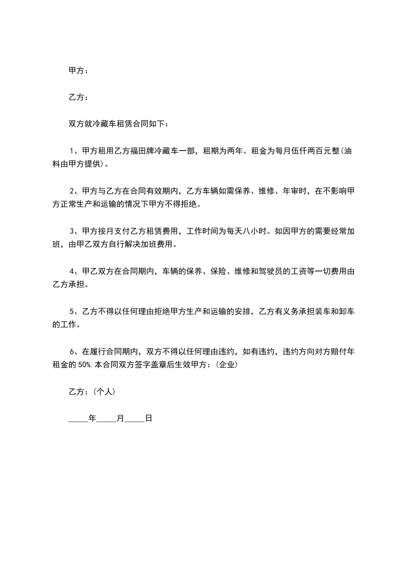 1、甲方租用乙方福田牌冷藏车一部,租期为两年。租金为每月伍仟两百元整(油料由甲方提供)。