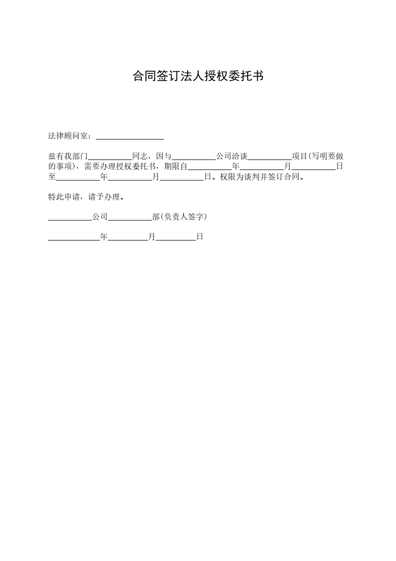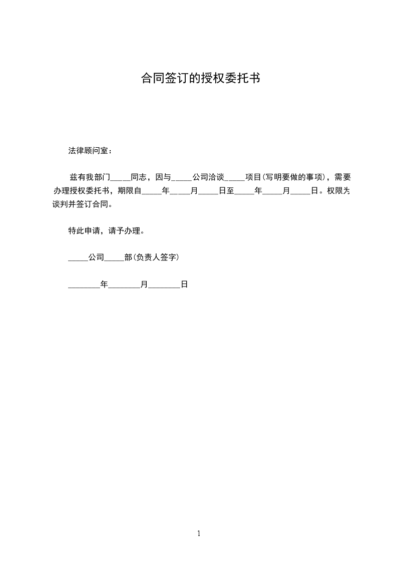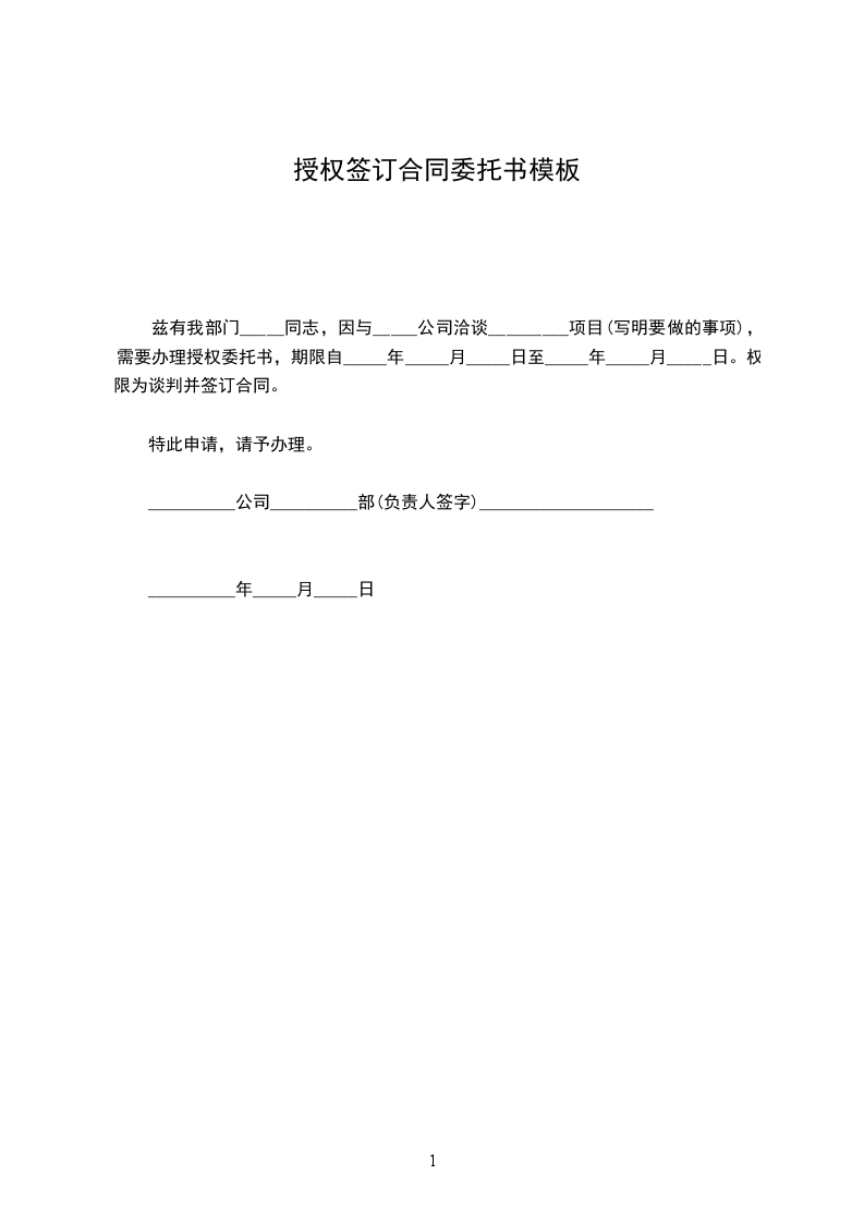兹有我部门___________同志,因与___________公司洽谈___________项目(写明要做的事项),需要办理授权委托书,期限自___________年___________月___________日至___________年___________月___________日。权限为谈判并签订合同。