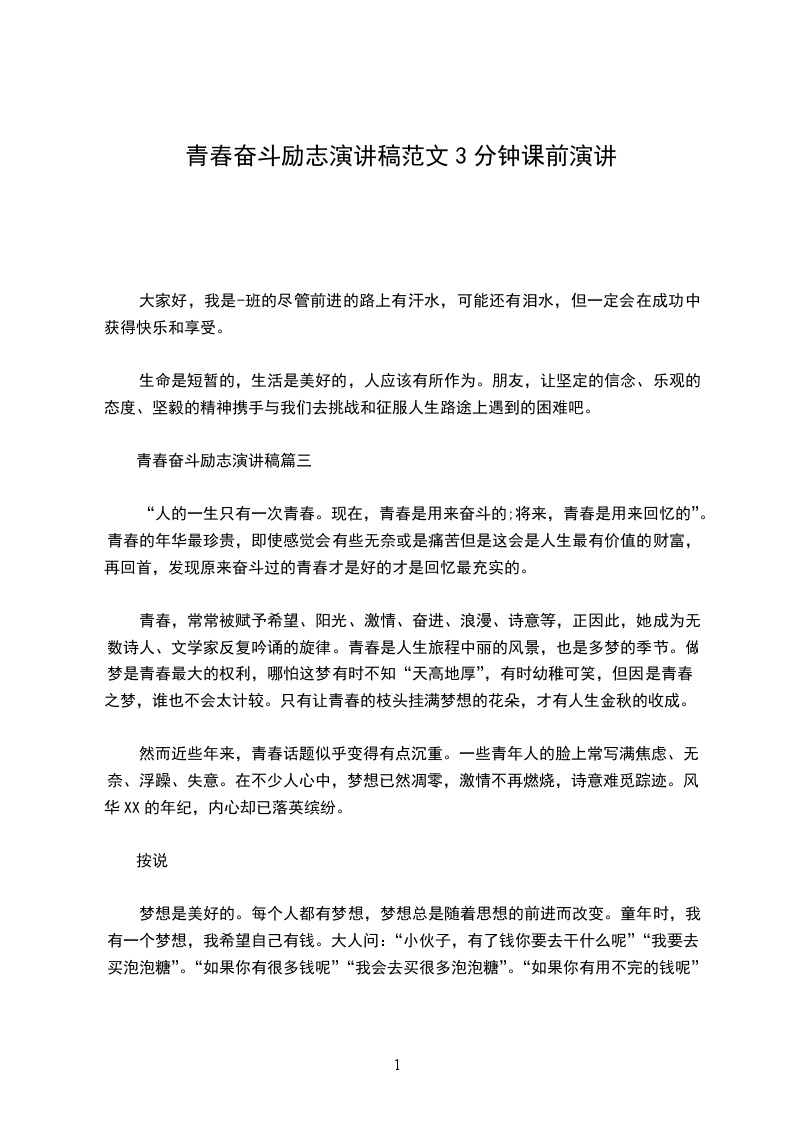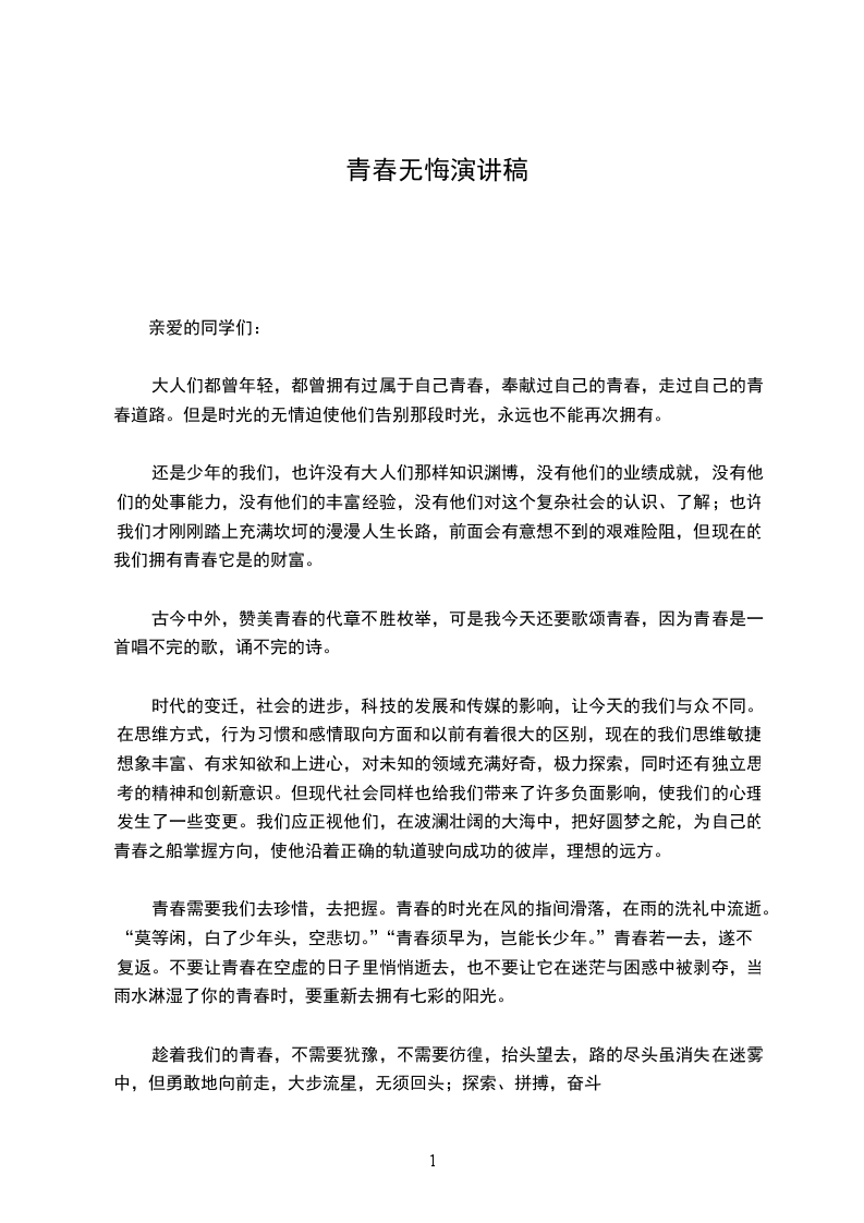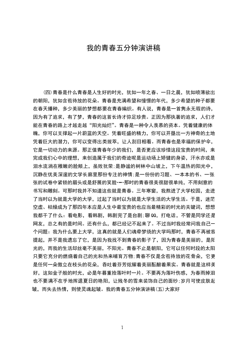 (四)青春是什么青春是人生好的时光,犹如一年之春、一日之晨,犹如喷薄欲出的朝阳,犹如含苞待放的花朵。青春是充满希望和憧憬的年代,多少希望的种子都要在春天播种,多少美丽的梦想都要在青春编织。有人说,青春是一首隽永无瑕的诗,因为有了追求,有了梦,青春的这首长诗才弥足珍贵。正因为那执著的追求,人们才能在青春的路上才越走越“阳光灿烂”。青春是一种令人羡慕的资本。凭着健康的体魄,你可以支撑起一片蔚蓝的天空。凭着旺盛的精力,你可以开垦出一方神奇的土地;凭着巨大的潜力,你可以变得出类拔萃,让人刮目相看。而青春也是幸福的保护伞,它是一切动力的来源。那正值青春年少的我们,是否更应该珍惜这段宝贵的时间,来完成我们心中的理想,来创造属于我们的奇迹呢是运动场上矫健的身姿,汗水亦或是泪水流淌在稚嫩的脸颊上,虽败犹荣;是静谧的树林中山坡上,下午温热的阳光中,沉静在优美深邃的文学长廊里那份专注的神情;是一份份的习题、一本本的书、一张张的试卷中紧锁的眉头或是舒展的笑脸……那时的青春很美很甜很单纯,不用刻意的书写和雕刻。可那时我并不知道这些就是青春。三年寒窗,我熬进了大学校园,走进了当时以为就是大学的大学,过起了当时以为就是大学生活的大学生活。于是,迷茫、空虚、枯燥成为了那四年本应是人生中最宝贵的也应当最精彩的时光的关键词,想想我都干了什么:看电影,看韩剧,韩剧完了是台剧;聊QQ,打电话,不管是同学还是网友,总之有的是时间。还有什么,都已经记不起来了。不过当时我经常问我自己一个问题:我为什么要上大学,这真的就是人们魂牵梦绕的大学吗那时,青春不再被我提起,并不是我遗忘了它,是因为我找不到青春的影子了,因为青春是美丽的,是阳光的,而我的生活却丝毫不美丽,不阳光。青春不止是朝阳,它可以任何时段的太阳,只要它充分的燃烧着自己的光和热来哺育万物;青春不仅是含苞待放的花骨朵,它更是任何一朵傲立在枝头的花朵,吞吐着芬芳炫耀着美丽酝酿着果实。青春就是这样美好,这如金子般的时光,必是年暮重拾落叶时一片。不要再为落叶伤感,为春雨掉泪;也不要满不在乎地挥退夏日的艳阳,让残冬的雪来装饰自己的面纱;岁月可使皮肤起皱,而失去热情,则使灵魂起皱。我的青春五分钟演讲稿(五)大家好