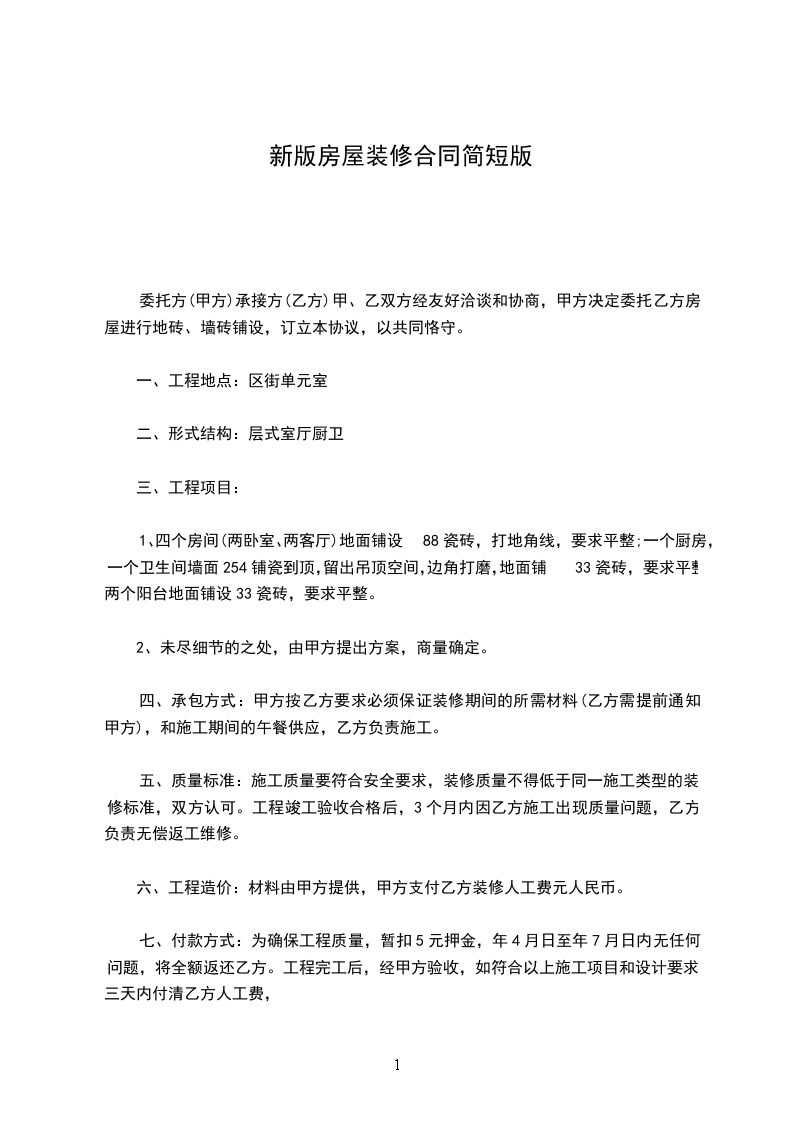 七、付款方式:为确保工程质量,暂扣5元押金,年4月日至年7月日内无任何问题,将全额返还乙方。工程完工后,经甲方验收,如符合以上施工项目和设计要求,三天内付清乙方人工费,