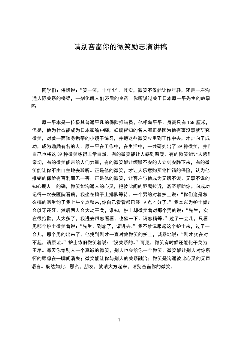 原一平本是一位极其普通平凡的保险推销员,他相貌平平,身高只有158厘米,但是,他为什么能成为日本家喻户晓,妇孺皆知的名人呢正是因为他有事没事就研究微笑,对着一面随身携带的小镜子练习,并把这些微笑应用到工作中去,才走向了成功,成为鼎鼎有名的人。原一平在工作中,在生活中,一共研究出了39种微笑,并且自己也将这39种微笑练得非常自然。有的微笑能让人感到温暖,有的微笑能让人感到亲切,有的微笑能带给人们力量,有的微笑能让烦躁不安的人立刻安静下来,有的微笑能让你不由自主地去聆听。正是他的微笑,才让人乐意购买他推销的保险,认为他推销的保险有百利而无一害;正是他的微笑,让客户与他成为无话不谈、无事不说的知心朋友。的确,微笑能沟通人的心灵,把彼此间的距离拉近,甚至帮助你走向成功。记得一次去医院看病,我坐在椅子上排队等待,一个男的对着护士说:“你们这是怎么搞的医生约了我上午9点整来,你自己看看都已经9点4分了。”我本以为护士肯定会以牙还牙,然后两人会大动干戈,谁知,护士却微笑着对那个男的说:“先生,实在很抱歉,人太多了,我进去帮您看看,也催一下。请您稍等。”过了一会儿,只看见那个护土微笑着说:“先生,到您了,请进去。”我不禁佩服起这个护士来,过了一会儿,那个男的出来了,他找到刚才一直对他微笑的护土,诚恳地说:“刚才实在对不起,请原谅。”护士依旧微笑着说:“没关系的。”可见,微笑有时候还能化干戈为玉帛。每天你给别人一个真诚的微笑,别人也会给你一个微笑。微笑能让别人对你所怀的顾虑在一瞬间消失;微笑能让你与别人的关系融洽;微笑是沟通彼此心灵的无声语言。既然如此,那么,朋友,就请大方起来,请别吝啬你的微笑。