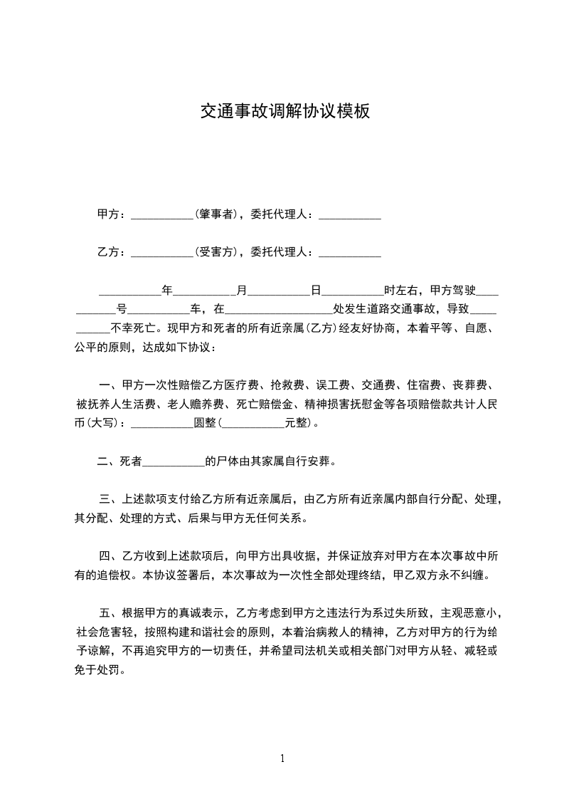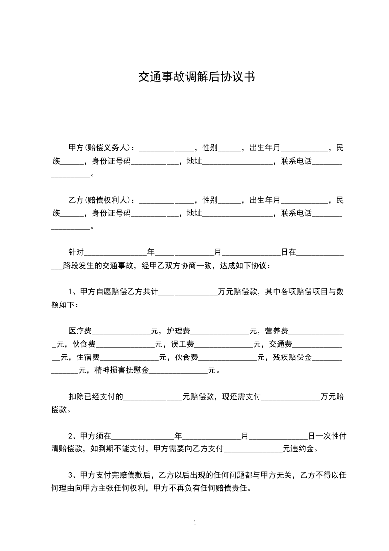 一、甲乙双方依据交通事故处理的一般原则达成一次性赔偿协议,甲方一次性赔偿给乙方赔偿金_____元(大写:________元),包括先前已经支付的医疗费用_____元(大写:________元)人民币。