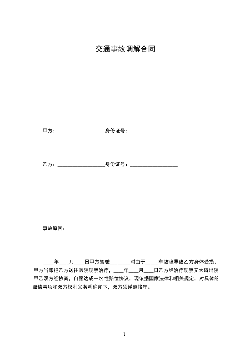 ____年____月____日甲方驾驶________时由于_____车故障导致乙方身体受损,甲方当即把乙方送往医院观察治疗,____年____月____日乙方经治疗观察无大碍出院,甲乙双方经协商,自愿达成一次性赔偿协议,现依据国家法律和相关规定,对具体的赔偿事项和双方权利义务明确如下,双方须谨遵恪守。