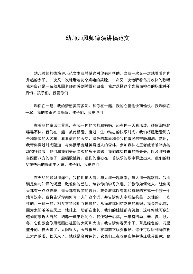 幼儿教师师德演讲示范文本我希望这对你有所帮助。当我一次又一次地看着冉冉升起的太阳,一次又一次地看着花朵娇艳的笑脸,一次又一次地听着鸟儿欢快的歌唱,我为自己是一名幼儿园老师而感到骄傲和自豪,我对选择这个光荣而神圣的职业并不后悔。孩子们,我爱你们