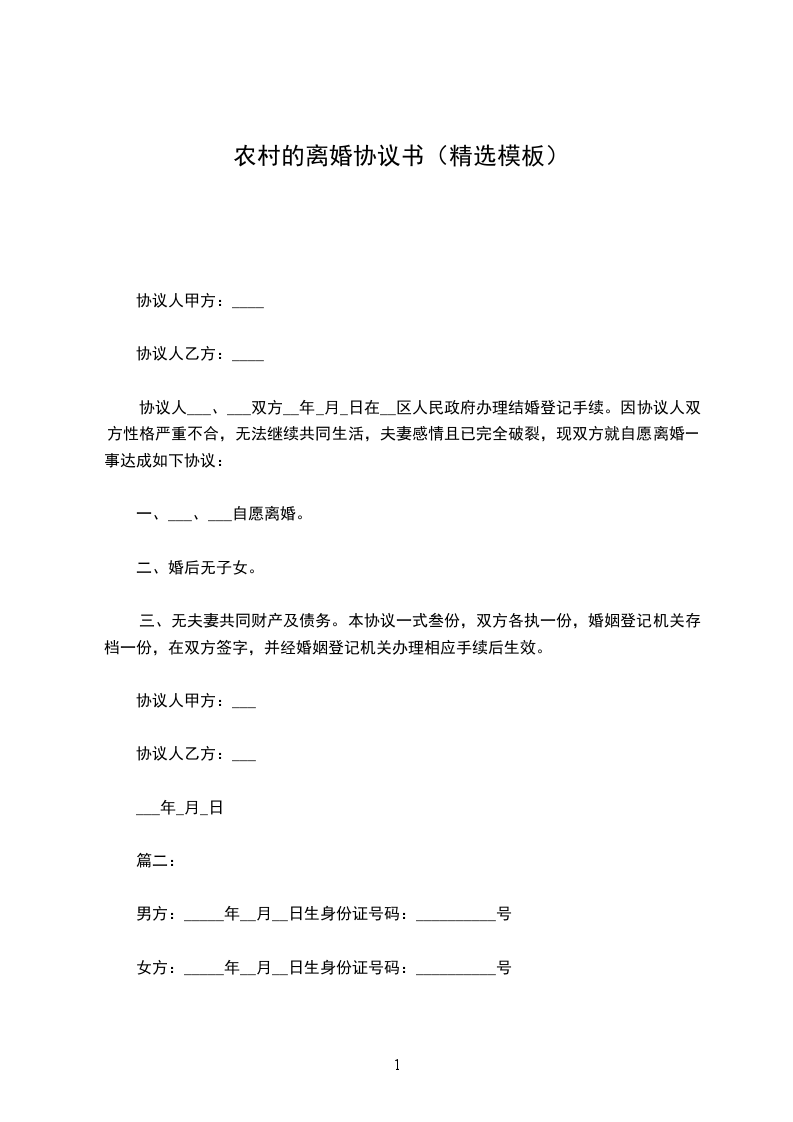 男女双方于_____________年办理登记结婚手续。婚后,有婚生子代一、代二,现年分别为_____岁和_____岁。婚后没有共同财产。有共同债务_______________元。现因夫妻双方长期性格不合,感情破裂,经双方充分协商,达成如下协议:_________________