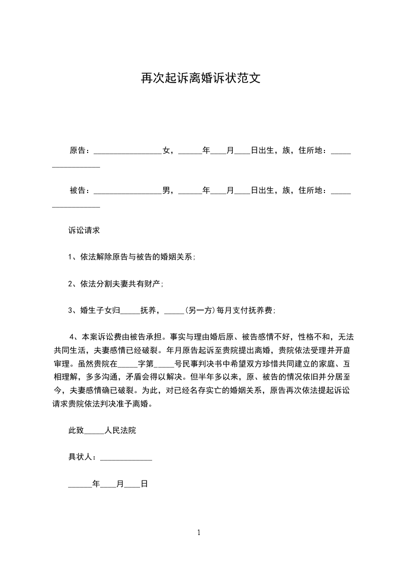 4、本案诉讼费由被告承担。事实与理由婚后原、被告感情不好,性格不和,无法共同生活,夫妻感情已经破裂。年月原告起诉至贵院提出离婚,贵院依法受理并开庭审理。虽然贵院在_____字第_____号民事判决书中希望双方珍惜共同建立的家庭、互相理解,多多沟通,矛盾会得以解决。但半年多以来,原、被告的情况依旧并分居至今,夫妻感情确已破裂。为此,对已经名存实亡的婚姻关系,原告再次依法提起诉讼,请求贵院依法判决准予离婚。