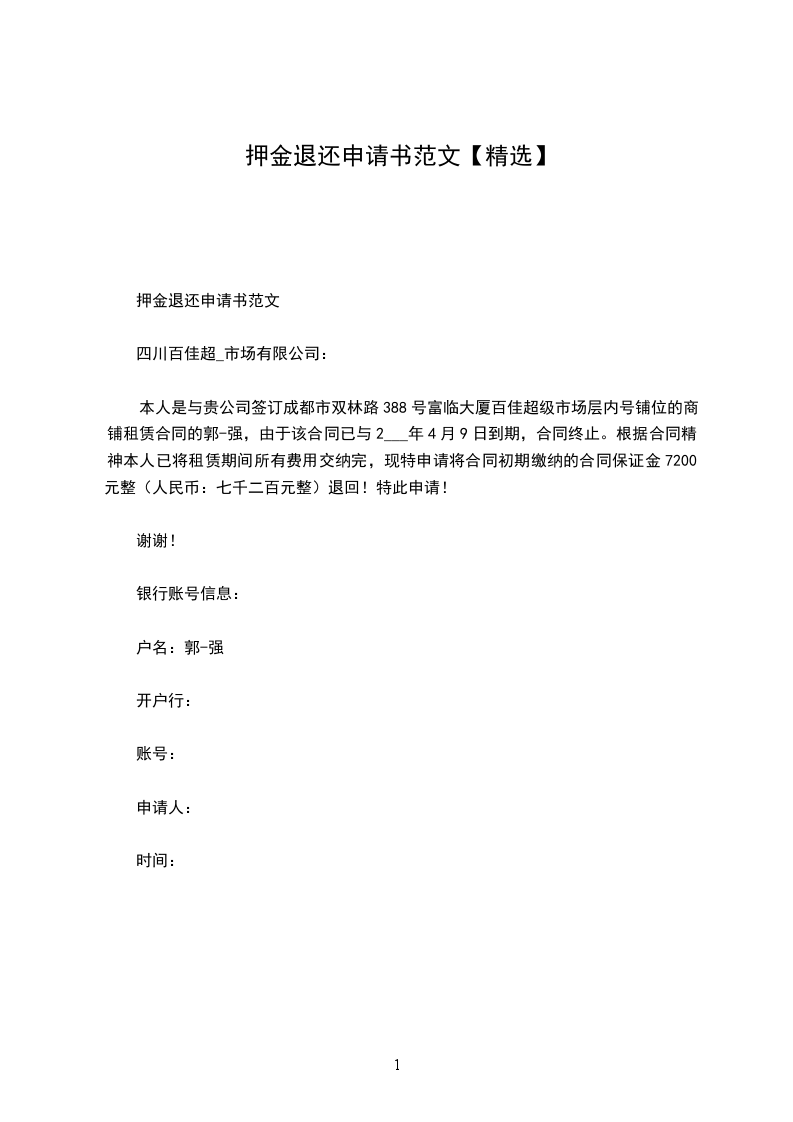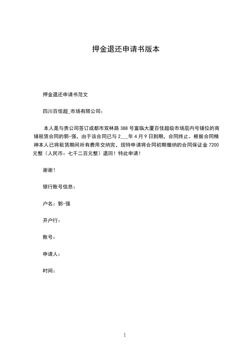 本人是与贵公司签订成都市双林路388号富临大厦百佳超级市场层内号铺位的商铺租赁合同的郭-强,由于该合同已与2024年4月9日到期,合同终止。根据合同精神本人已将租赁期间所有费用交纳完,现特申请将合同初期缴纳的合同保证金7200元整(人民币:七千二百元整)退回!特此申请!