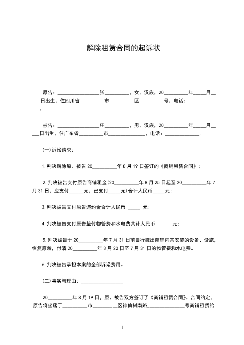 1.判决解除原、被告20__________年8月19日签订的《商铺租赁合同》;