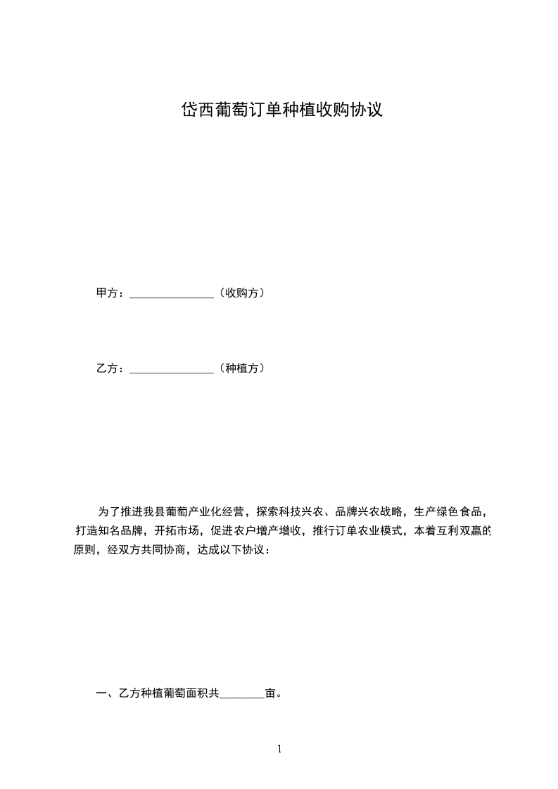 为了推进我县葡萄产业化经营,探索科技兴农、品牌兴农战略,生产绿色食品,打造知名品牌,开拓市场,促进农户增产增收,推行订单农业模式,本着互利双赢的原则,经双方共同协商,达成以下协议: