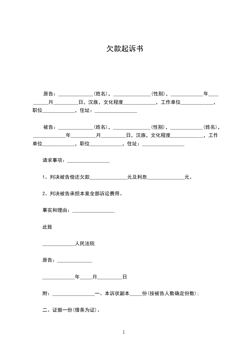 附:_________________一、本诉状副本_____份(按被告人数确定份数);