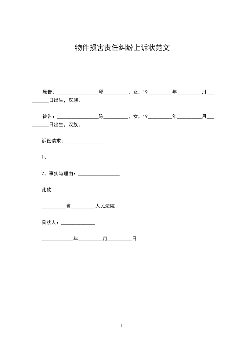 原告:_________________邱__________,女,19__________年__________月__________日出生,汉族,