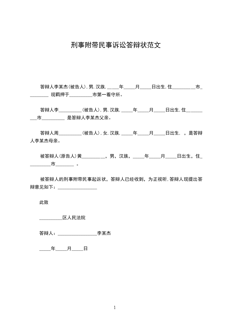答辩人周__________(被告人),女,汉族,_____年_____月_____日出生, ,是答辩人李某杰母亲。