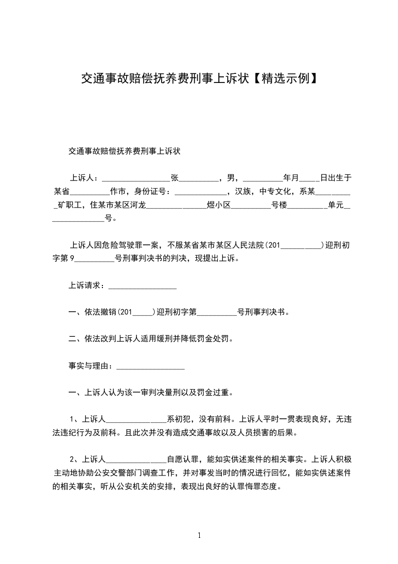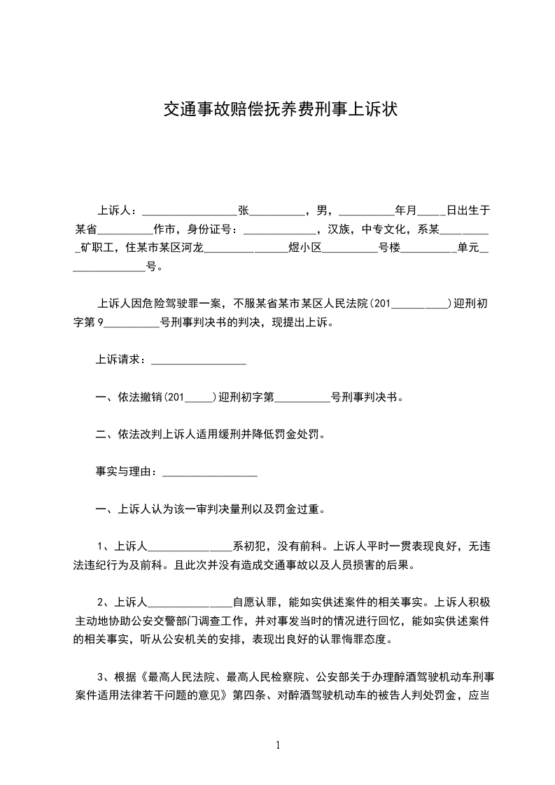 1、上诉人_______________系初犯,没有前科。上诉人平时一贯表现良好,无违法违纪行为及前科。且此次并没有造成交通事故以及人员损害的后果。
