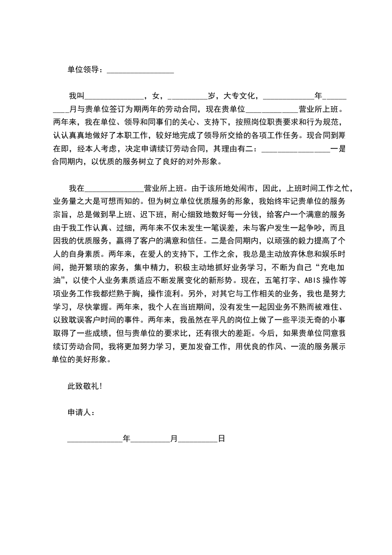 我叫_______________,女,__________岁,大专文化,_____________年__________月与贵单位签订为期两年的劳动合同,现在贵单位_____________营业所上班。两年来,我在单位、领导和同事们的关心、支持下,按照岗位职责要求和行为规范,认认真真地做好了本职工作,较好地完成了领导所交给的各项工作任务。现合同到期在即,经本人考虑,决定申请续订劳动合同,其理由有二:_________________一是合同期内,以优质的服务树立了良好的对外形象。
