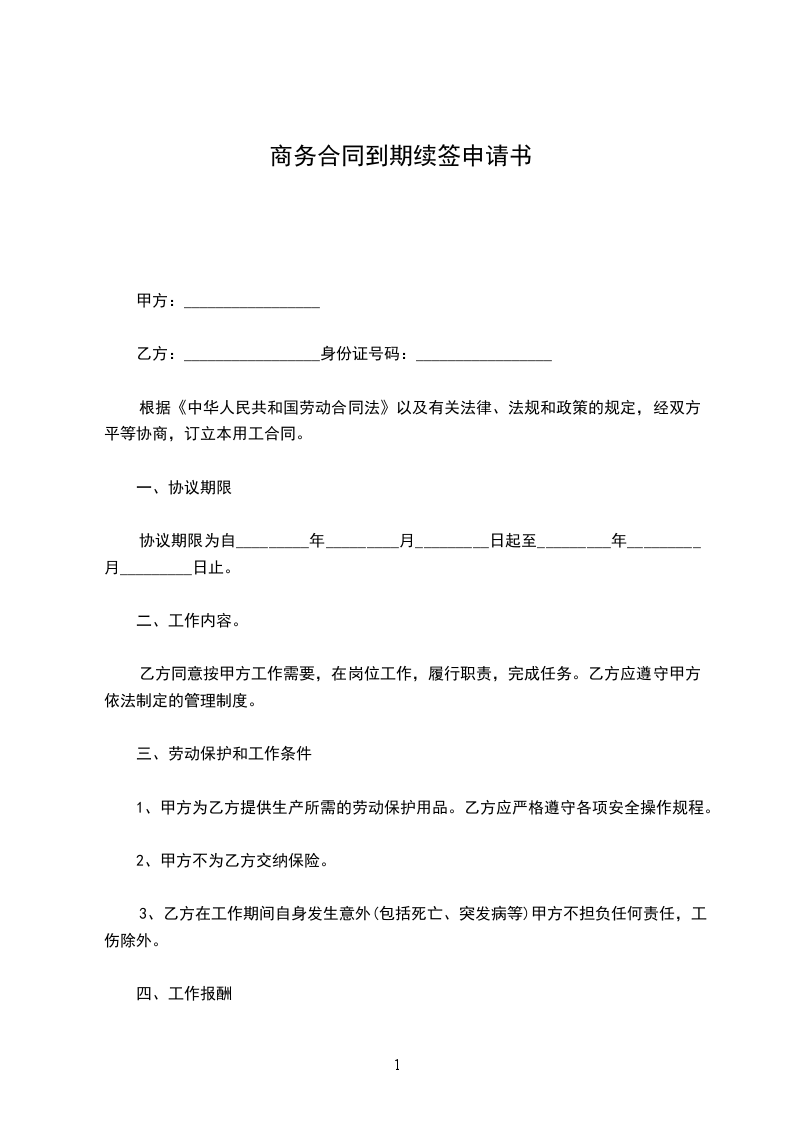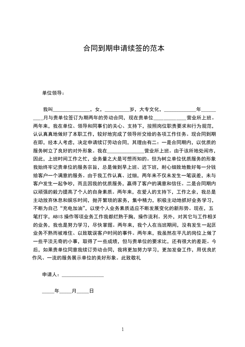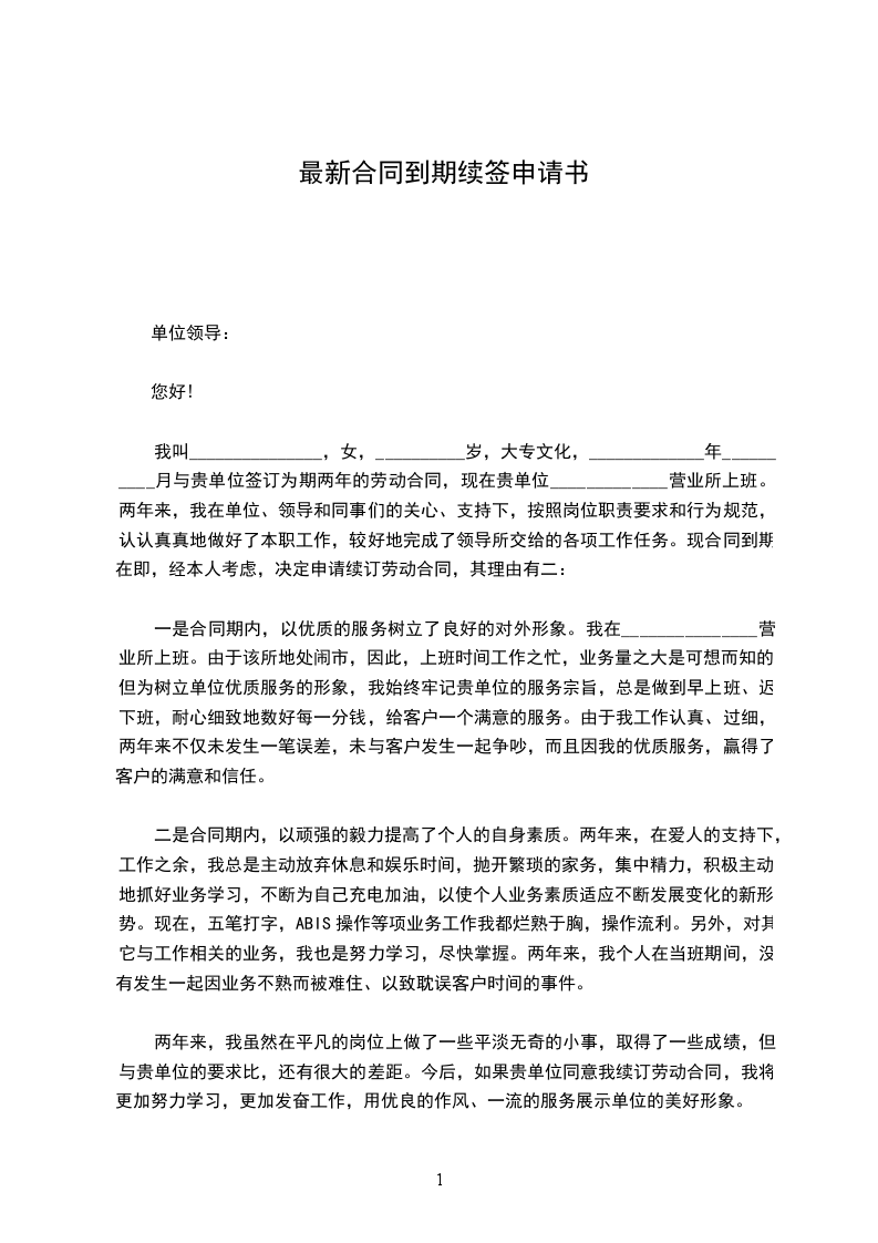 我叫_______________,女,__________岁,大专文化,_____________年__________月与贵单位签订为期两年的劳动合同,现在贵单位_____________营业所上班。两年来,我在单位、领导和同事们的关心、支持下,按照岗位职责要求和行为规范,认认真真地做好了本职工作,较好地完成了领导所交给的各项工作任务。现合同到期在即,经本人考虑,决定申请续订劳动合同,其理由有二:_________________一是合同期内,以优质的服务树立了良好的对外形象。