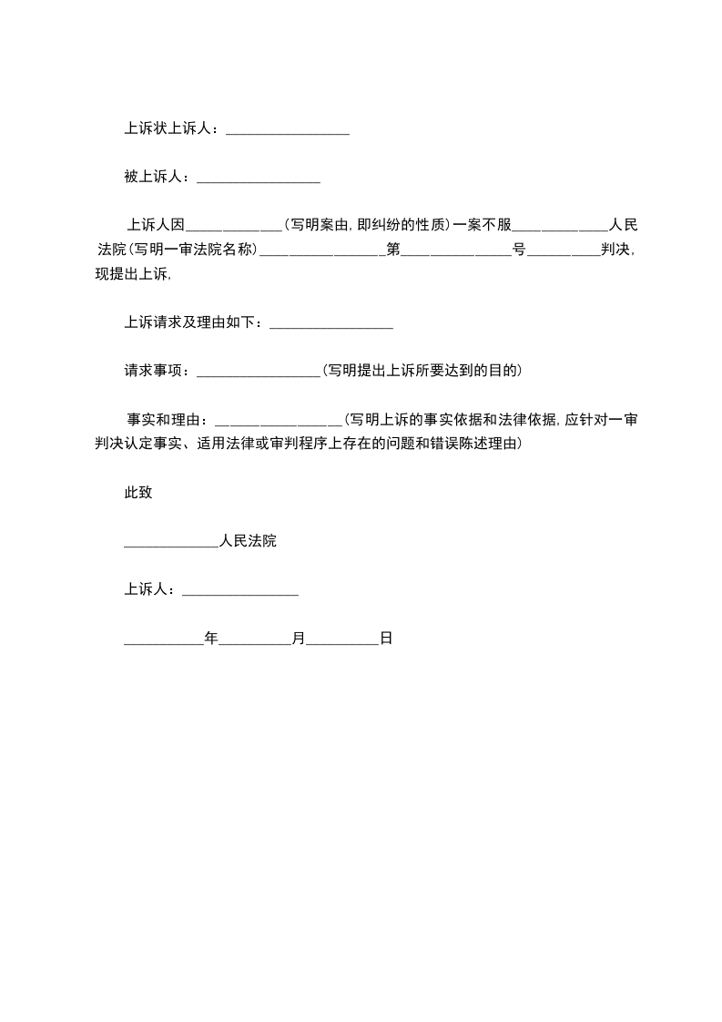 上诉人因_____________(写明案由,即纠纷的性质)一案不服_____________人民法院(写明一审法院名称)_________________第_______________号__________判决,现提出上诉,
