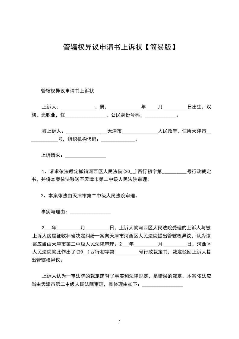 上诉人认为一审法院的裁定违背了事实和法律规定,是错误的裁定,本案依法应当由天津市第二中级人民法院审理,具体理由如下:_________________