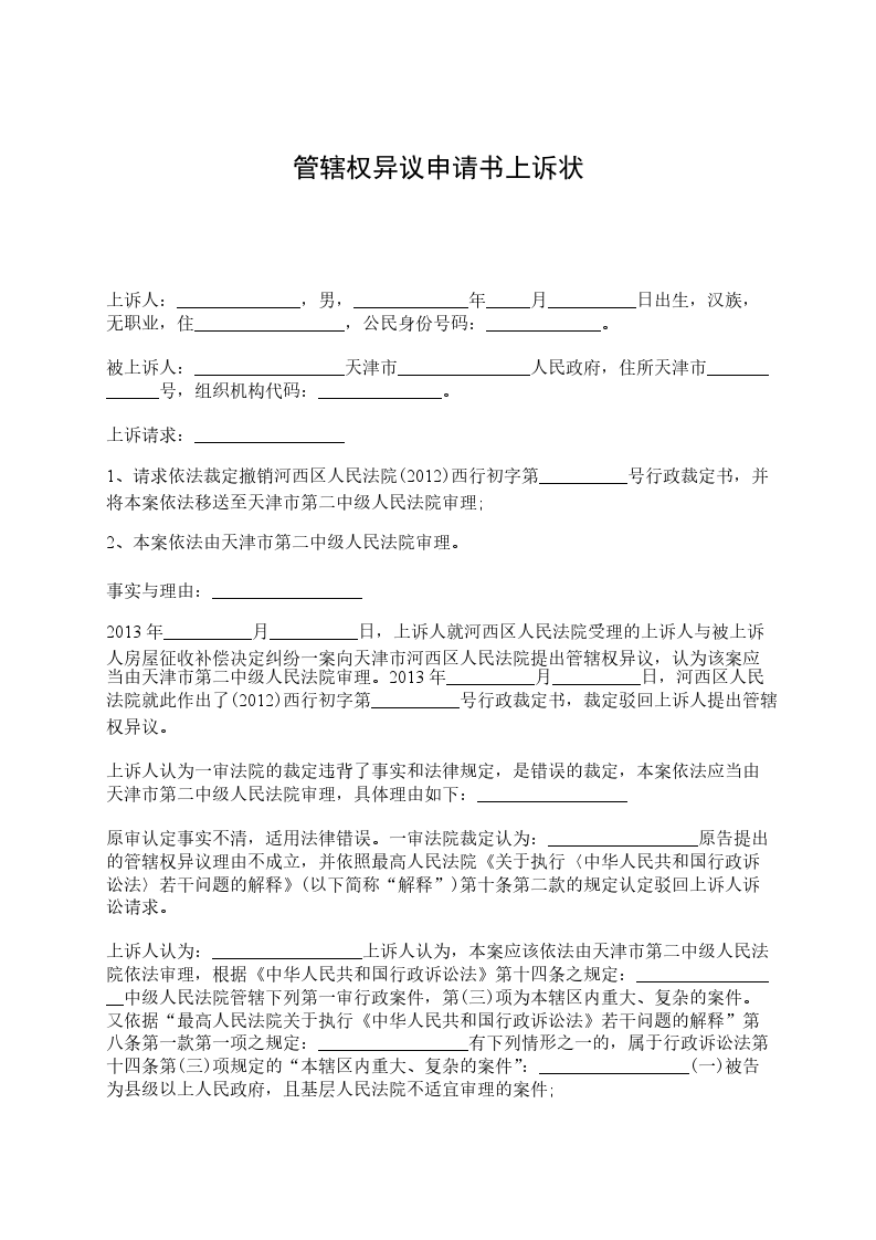 上诉人认为:_________________上诉人认为,本案应该依法由天津市第二中级人民法院依法审理,根据《中华人民共和国行政诉讼法》第十四条之规定:_________________中级人民法院管辖下列第一审行政案件,第(三)项为本辖区内重大、复杂的案件。又依据“最高人民法院关于执行《中华人民共和国行政诉讼法》若干问题的解释”第八条第一款第一项之规定:_________________有下列情形之一的,属于行政诉讼法第十四条第(三)项规定的“本辖区内重大、复杂的案件”:_________________(一)被告为县级以上人民政府,且基层人民法院不适宜审理的案件;