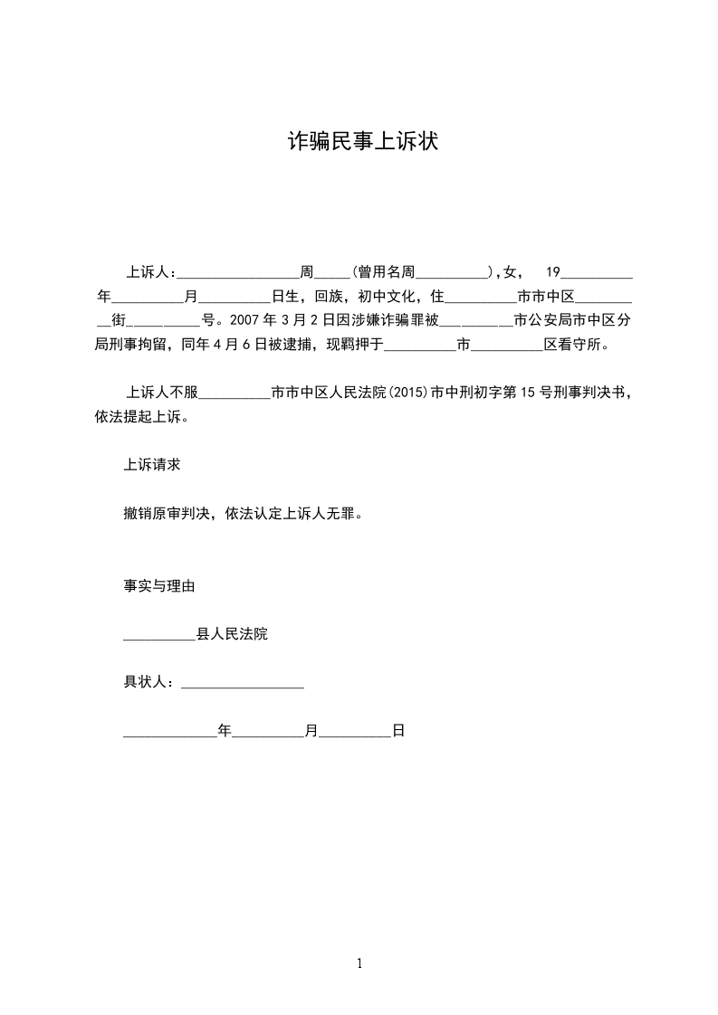 上诉人:_________________周_____(曾用名周__________),女,19__________年__________月__________日生,回族,初中文化,住__________市市中区__________街__________号。2007年3月2日因涉嫌诈骗罪被__________市公安局市中区分局刑事拘留,同年4月6日被逮捕,现羁押于__________市__________区看守所。