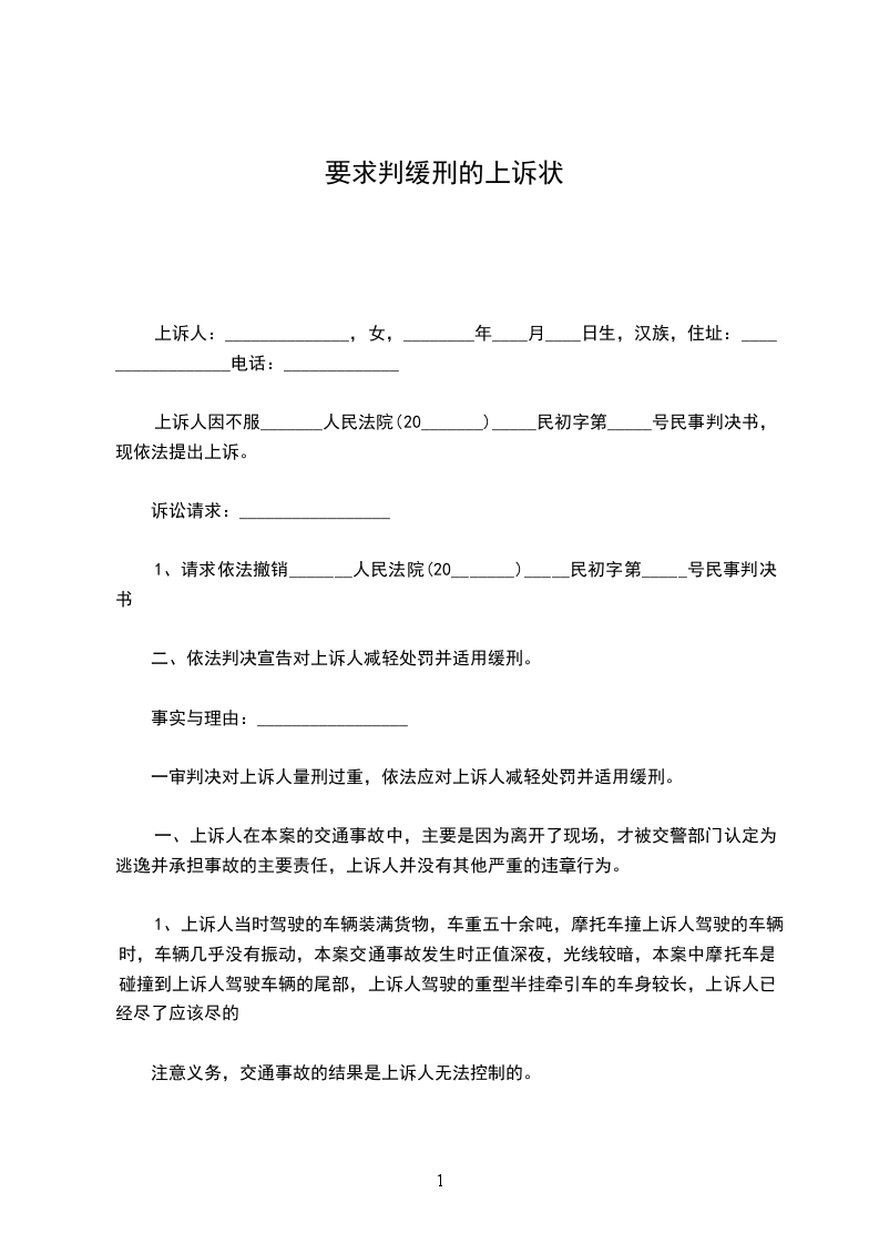 上诉人:______________,女,________年____月____日生,汉族,住址:_________________电话:_____________