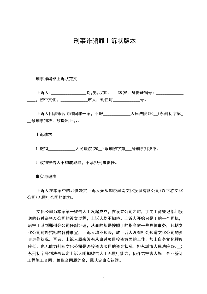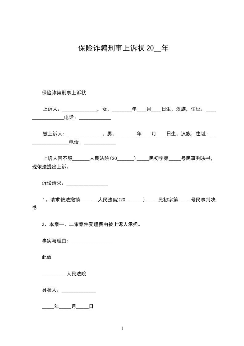 上诉人:______________,女,________年____月____日生,汉族,住址:_________________电话:_____________