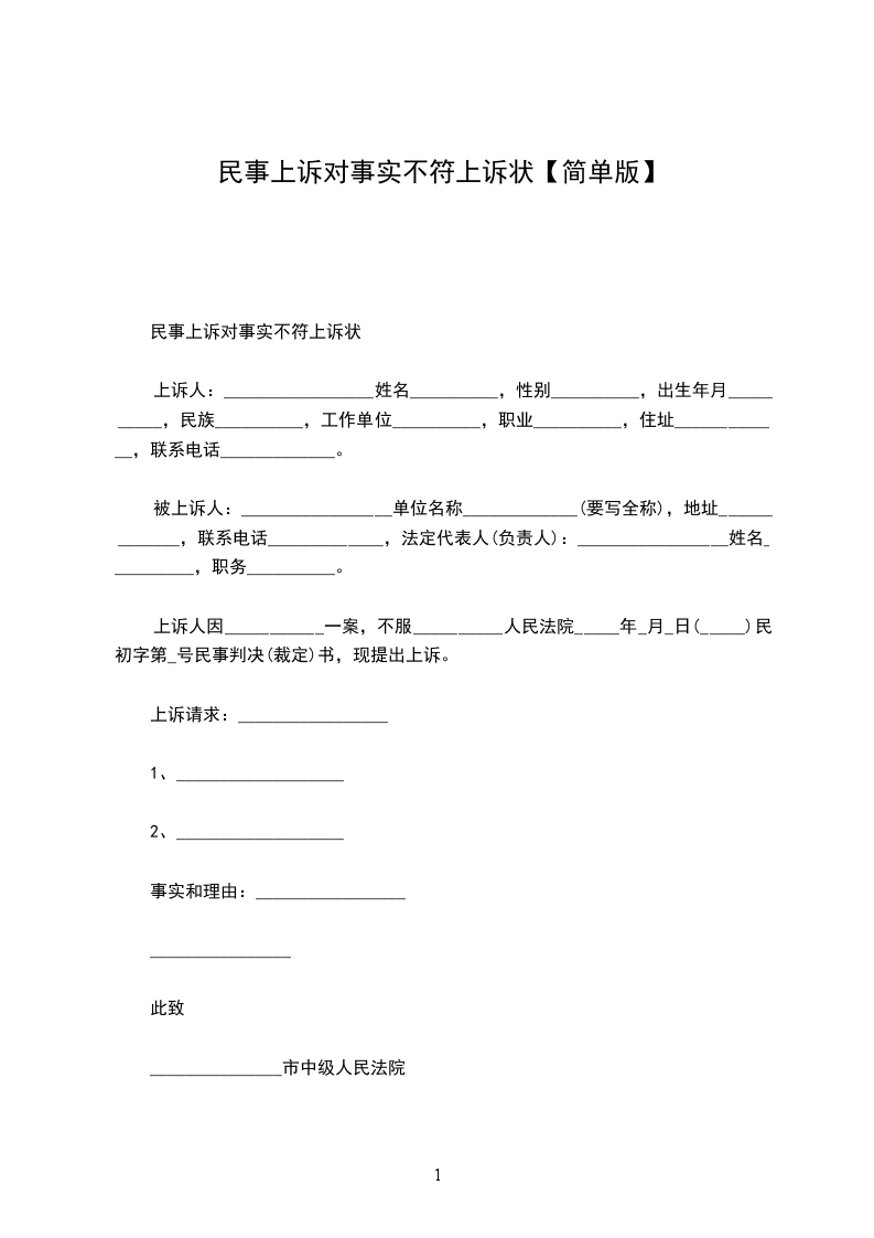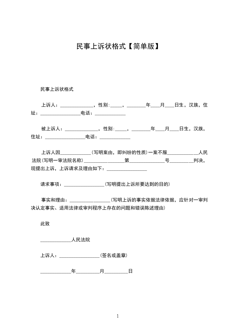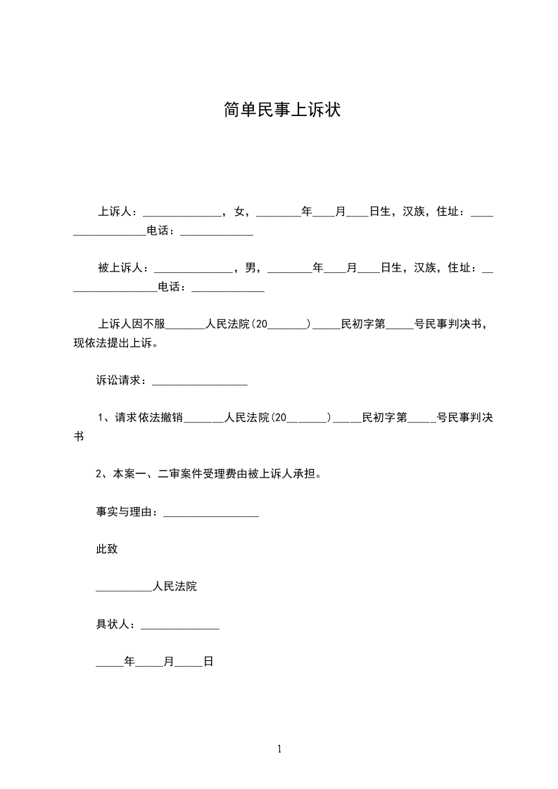上诉人:______________,女,________年____月____日生,汉族,住址:_________________电话:_____________