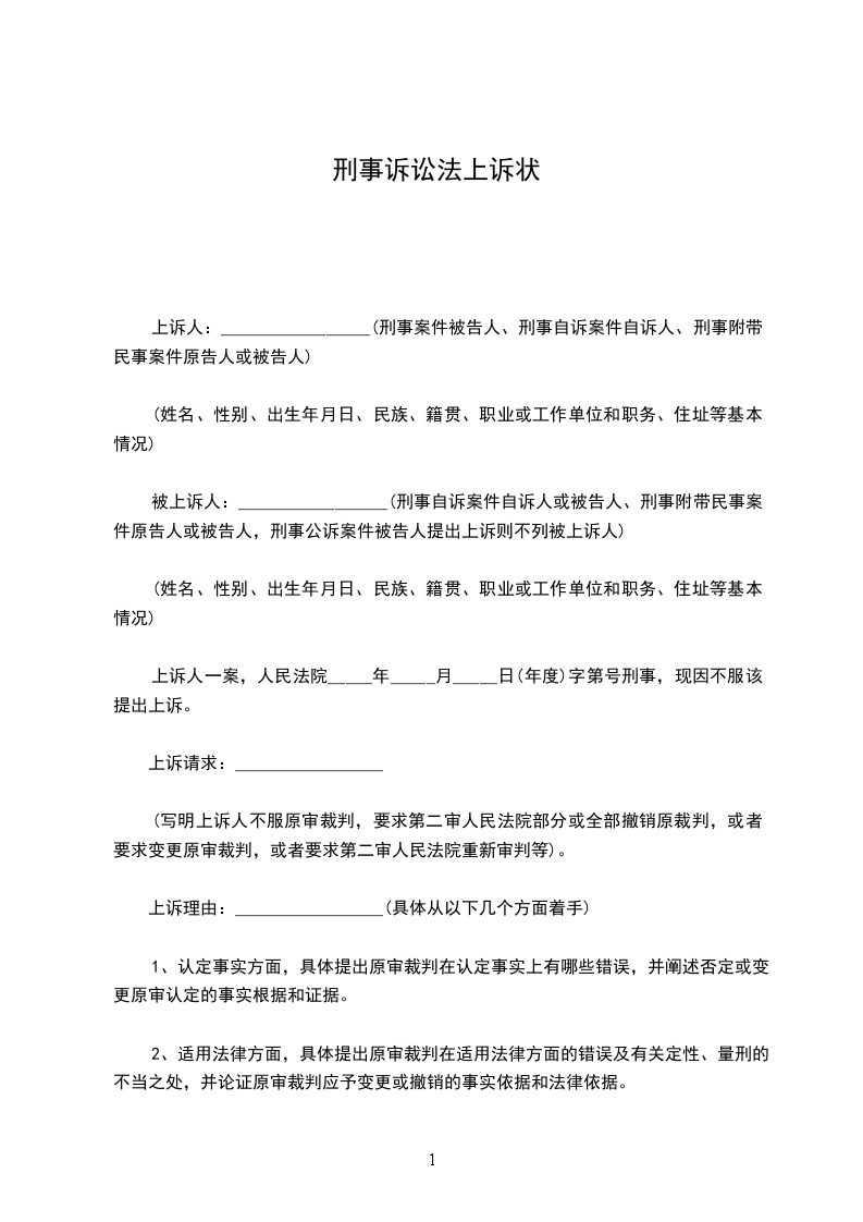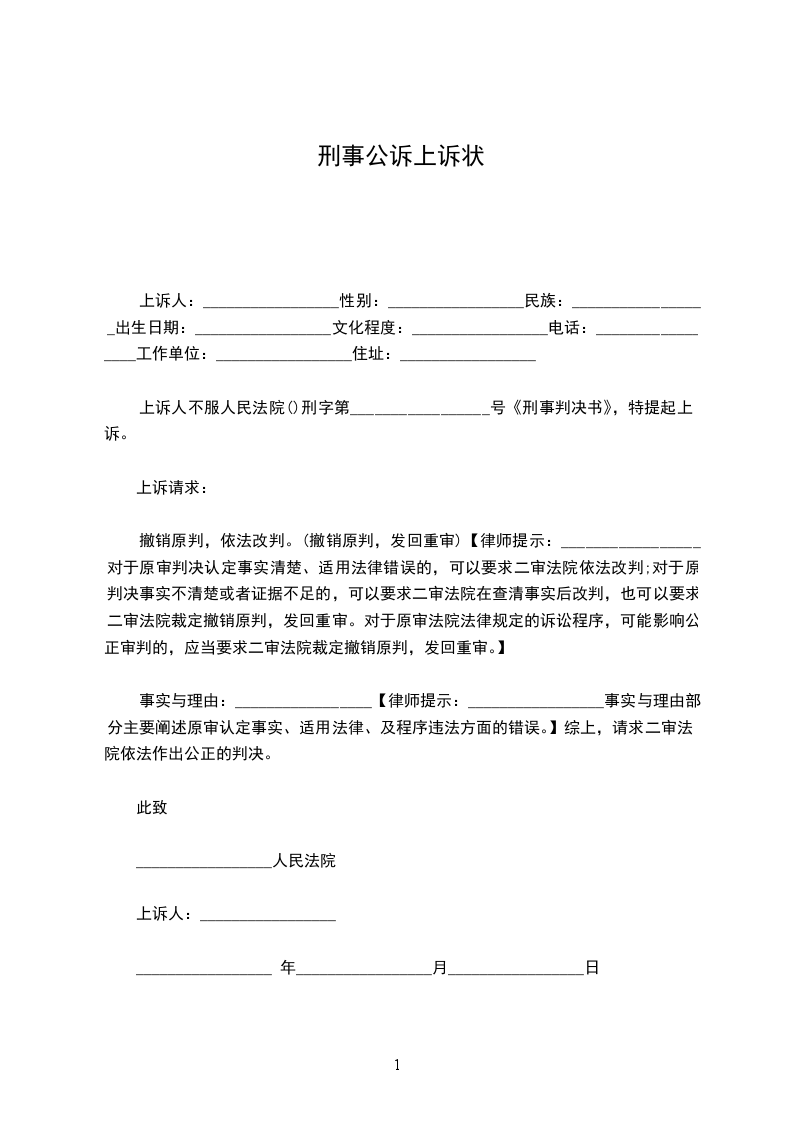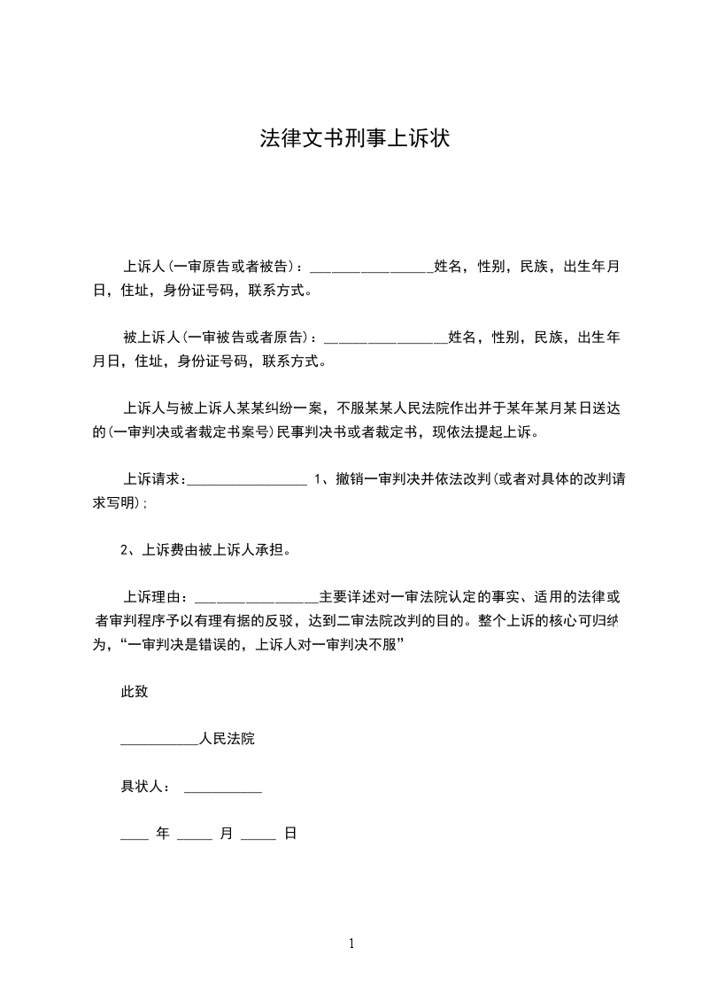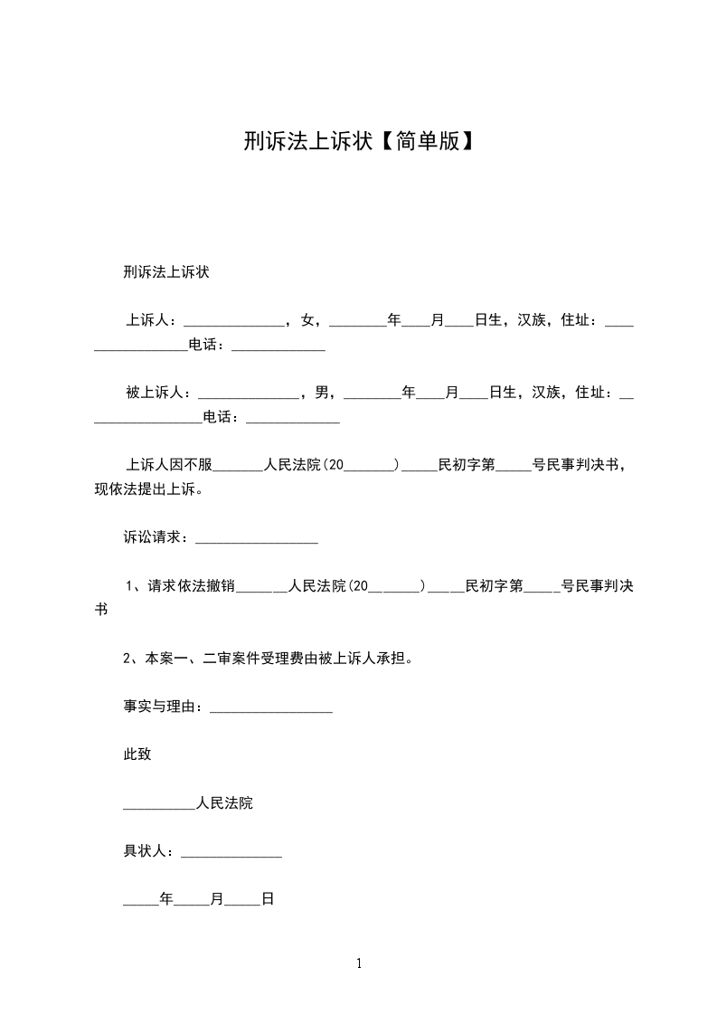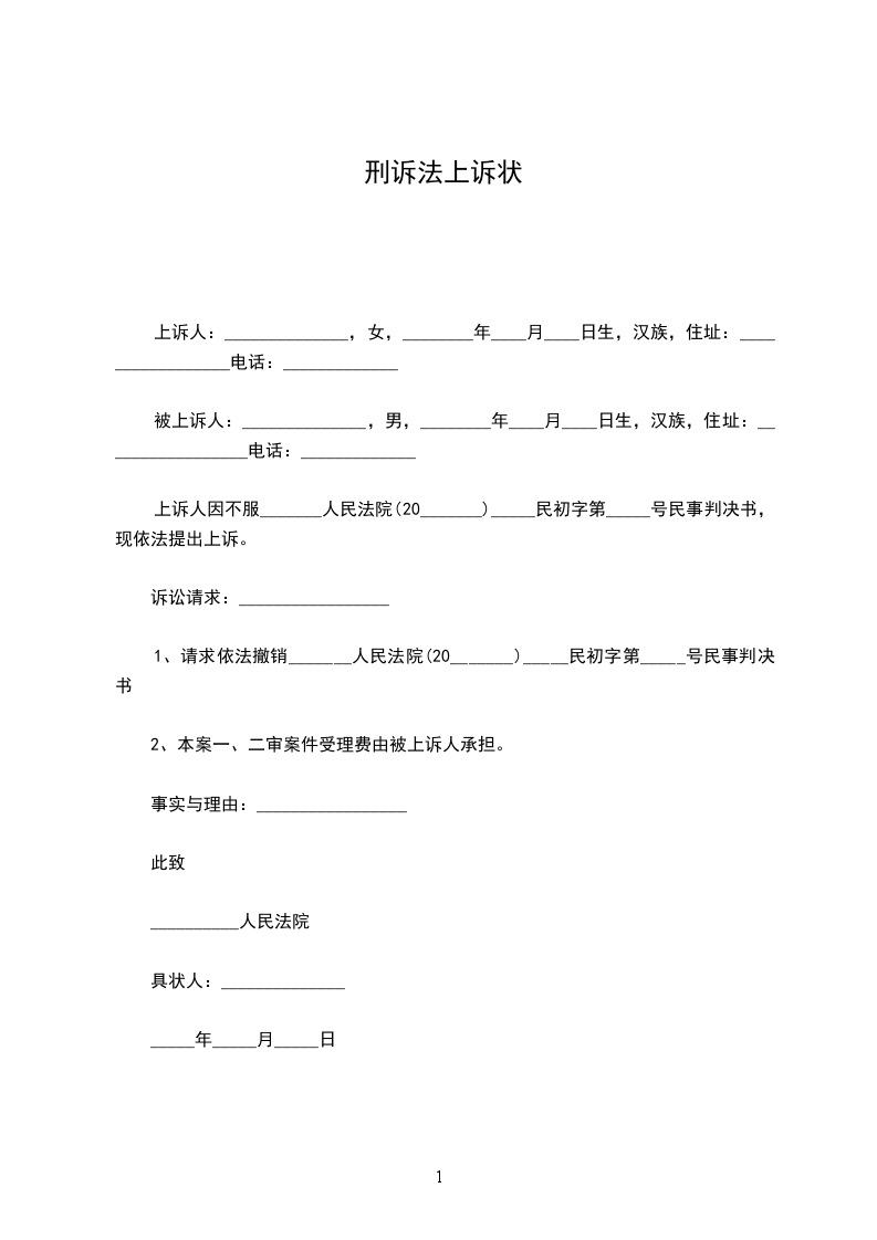 上诉人:______________,女,________年____月____日生,汉族,住址:_________________电话:_____________