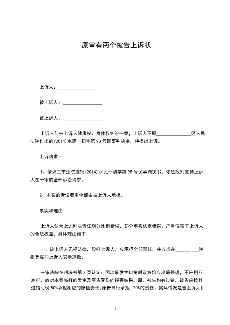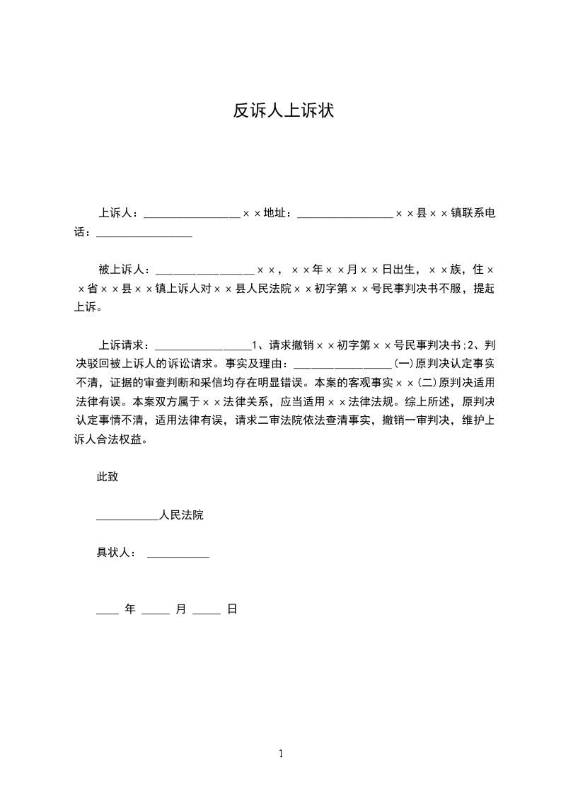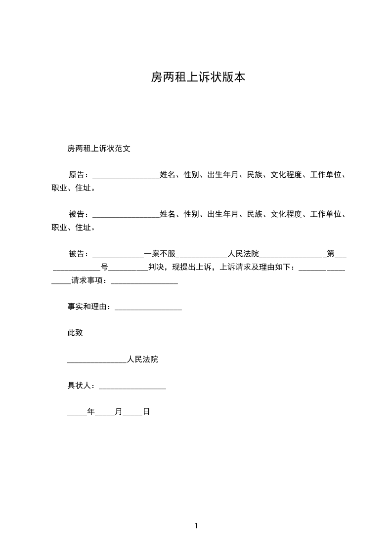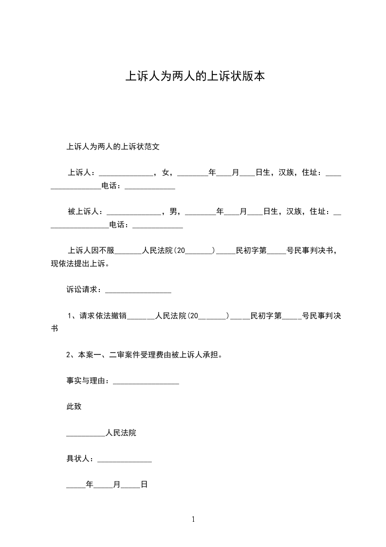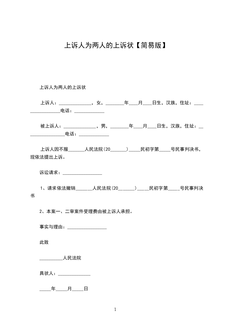 上诉人:______________,女,________年____月____日生,汉族,住址:_________________电话:_____________