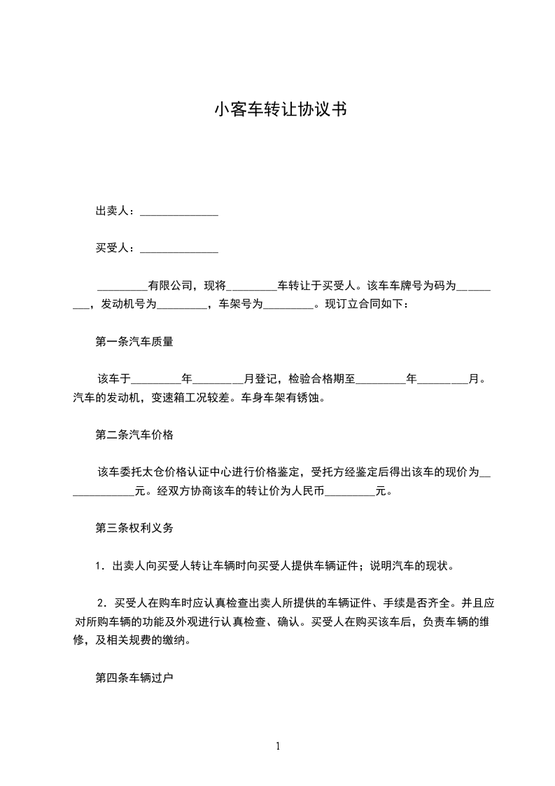 _________有限公司,现将_________车转让于买受人。该车车牌号为码为_________,发动机号为_________,车架号为_________。现订立合同如下: