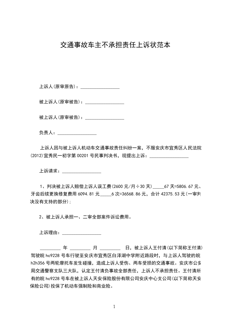 上诉人因与被上诉人机动车交通事故责任纠纷一案,不服安庆市宜秀区人民法院(2024)宜秀民一初字第00201号民事判决书,现提出上诉:_________________