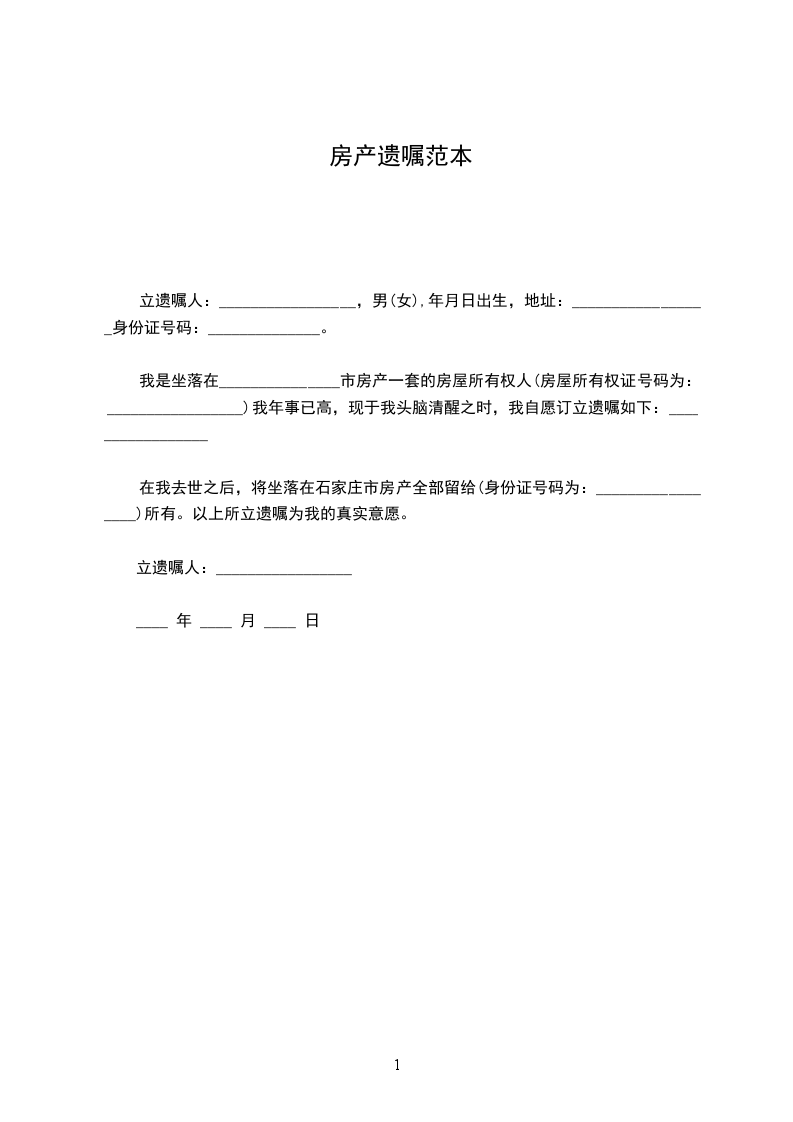 在我去世之后,将坐落在石家庄市房产全部留给(身份证号码为:_________________)所有。以上所立遗嘱为我的真实意愿。