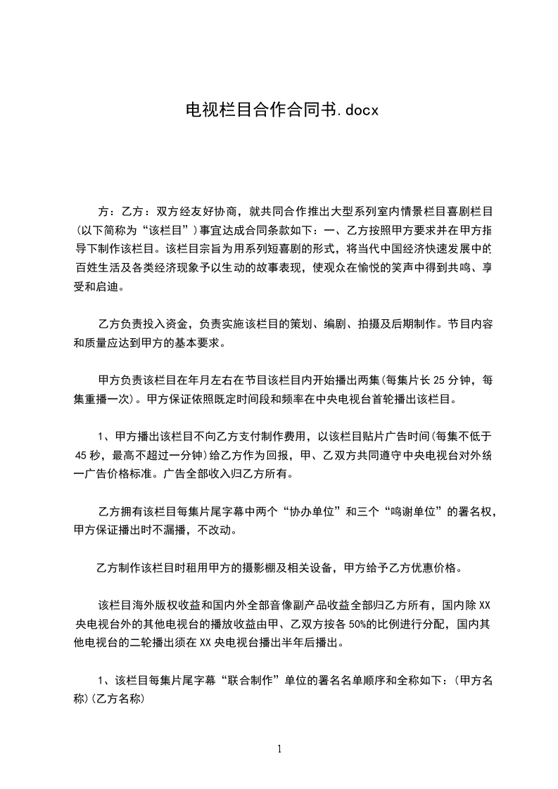 1.甲方播出该栏目不向乙方支付制作费用,以该栏目贴片广告时间(每集不低于45秒,最高不超过一分钟)给乙方作为回报,甲、乙双方共同遵守中央电视台对外统一广告价格标准。广告全部收入归乙方所有。