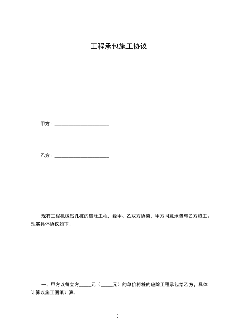 一、甲方以每立方_____元(_____元)的单价将桩的破除工程承包给乙方,具体计算以施工图纸计算。