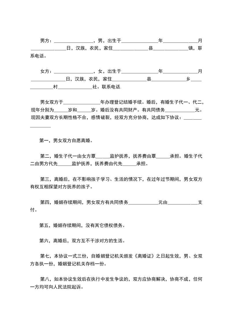 男女双方于________________年办理登记结婚手续。婚后,有婚生子代一、代二,现年分别为______岁和______岁。婚后没有共同财产。有共同债务_____________元。现因夫妻双方长期性格不合,感情破裂,经双方充分协商,达成如下协议:_________________
