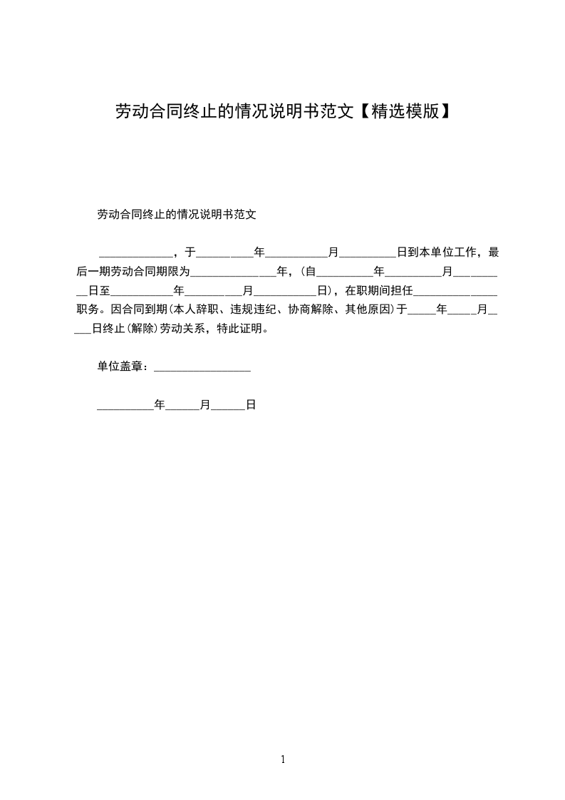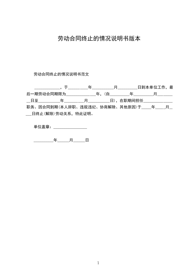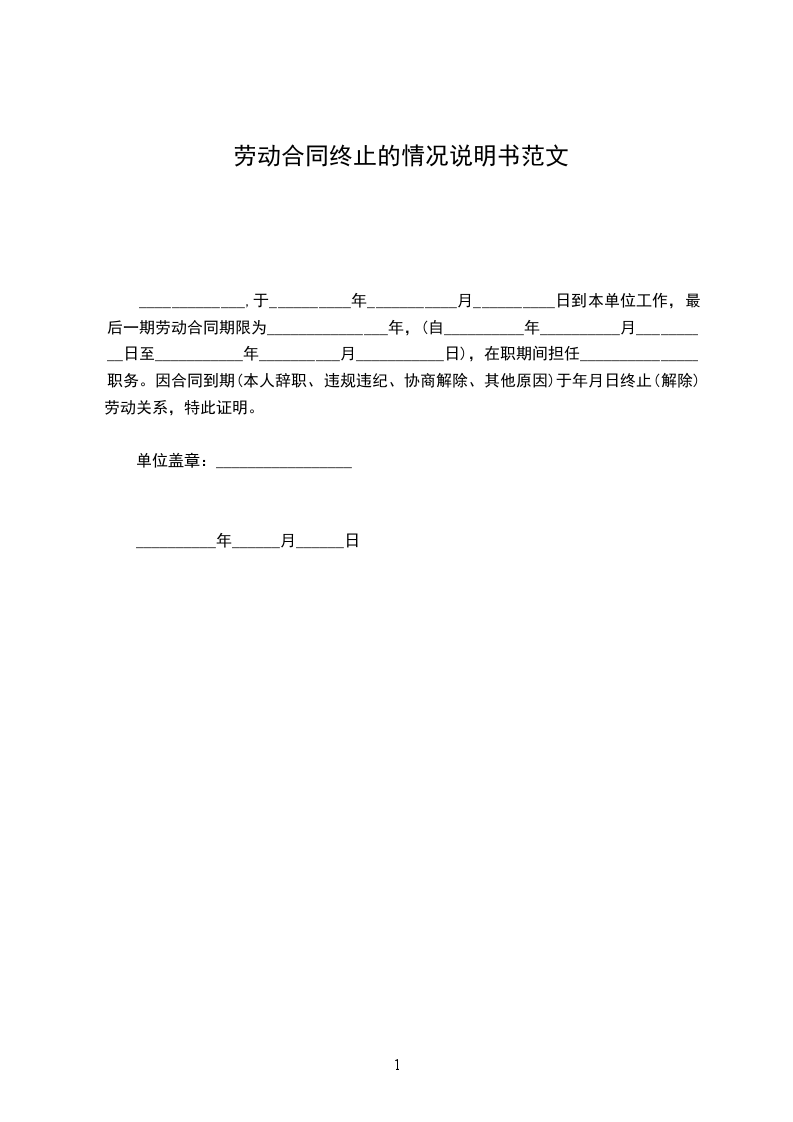 _____________,于__________年___________月__________日到本单位工作,最后一期劳动合同期限为_______________年,(自__________年__________月__________日至___________年__________月___________日),在职期间担任_______________职务。因合同到期(本人辞职、违规违纪、协商解除、其他原因)于_____年_____月_____日终止(解除)劳动关系,特此证明。