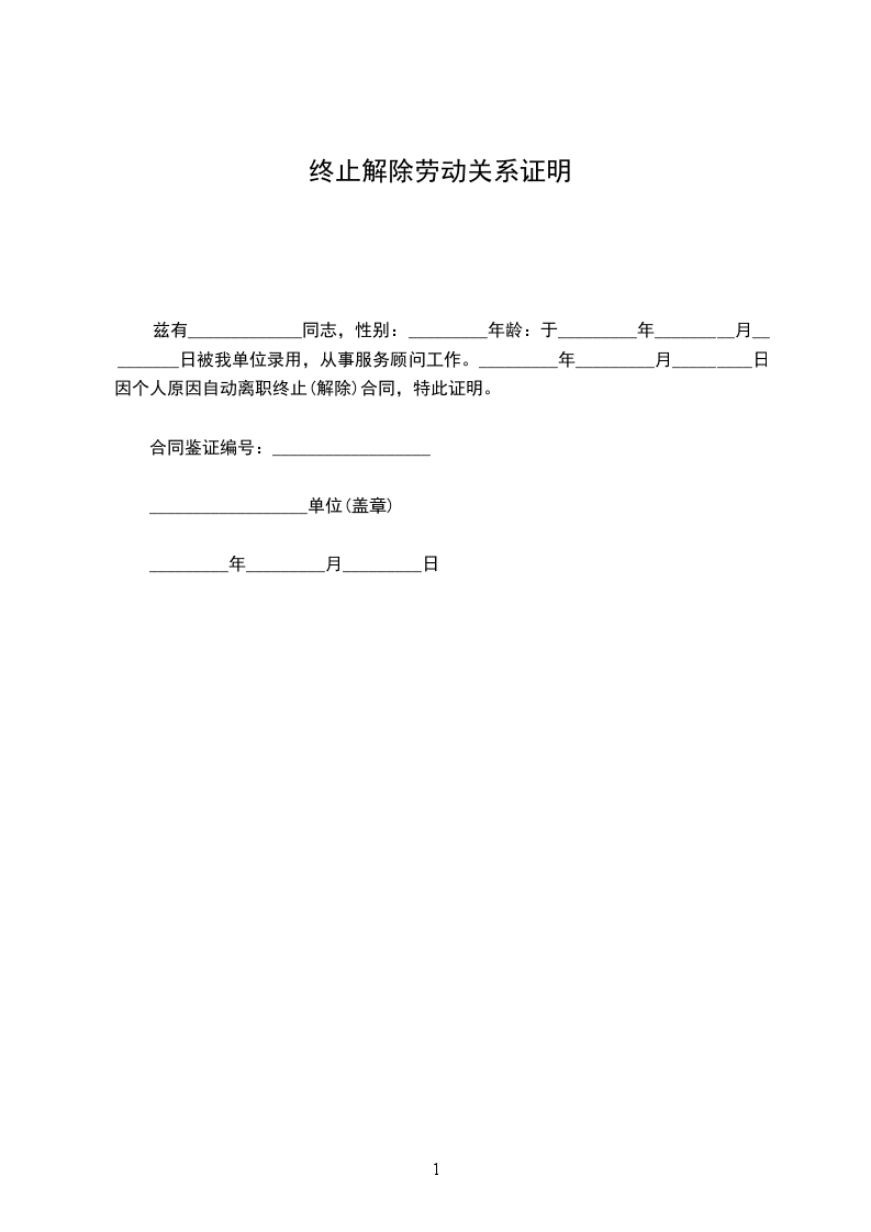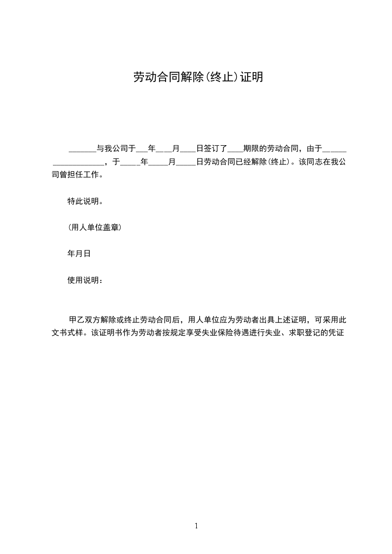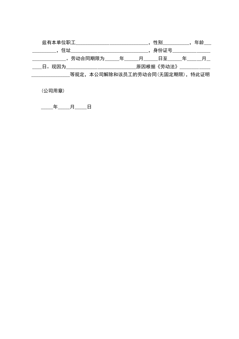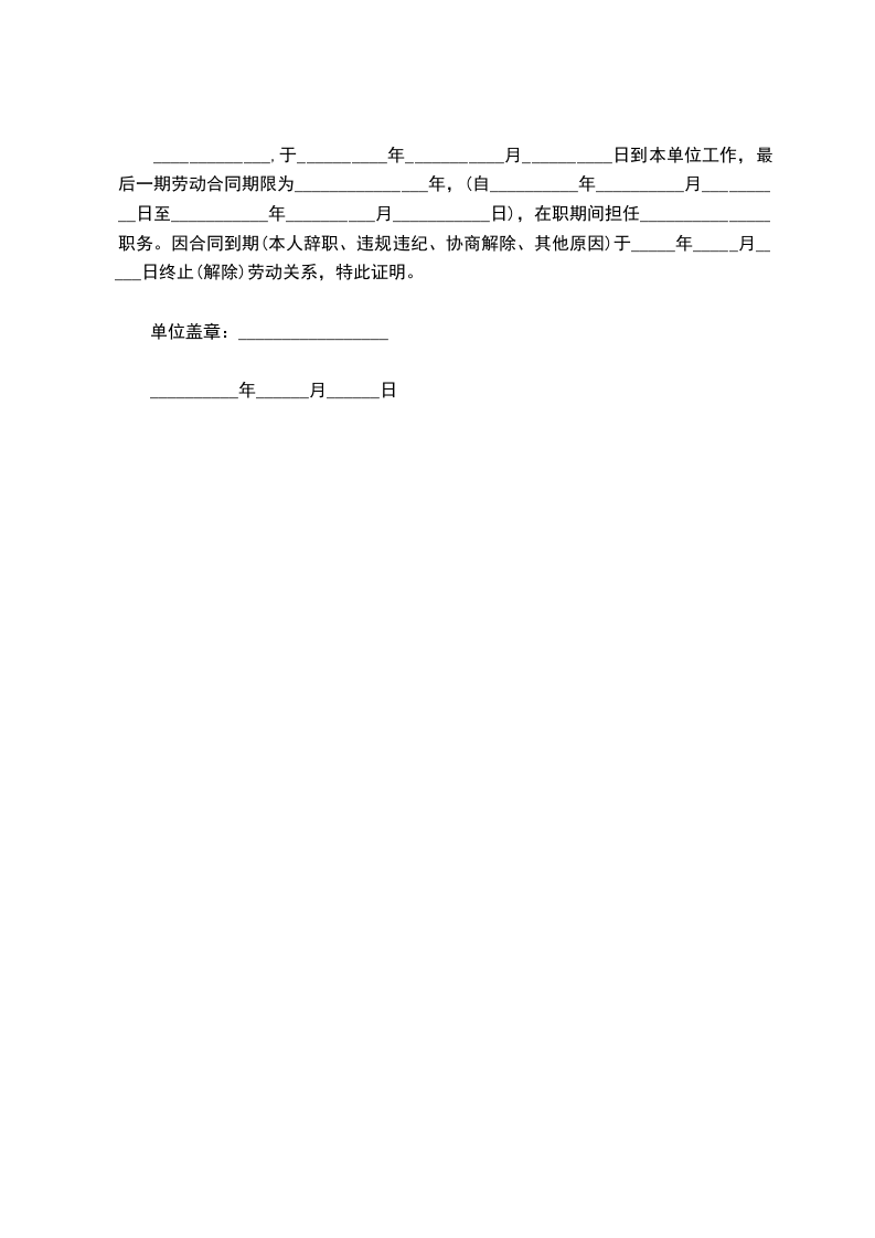 _____________,于__________年___________月__________日到本单位工作,最后一期劳动合同期限为_______________年,(自__________年__________月__________日至___________年__________月___________日),在职期间担任_______________职务。因合同到期(本人辞职、违规违纪、协商解除、其他原因)于_____年_____月_____日终止(解除)劳动关系,特此证明。