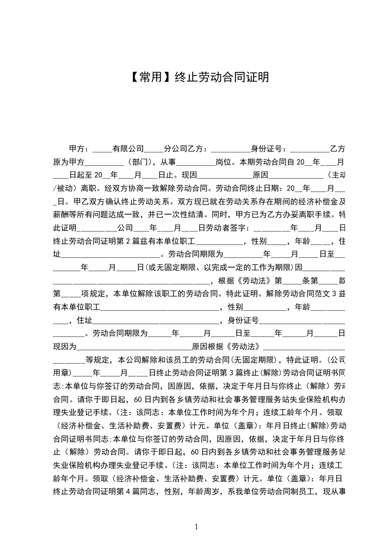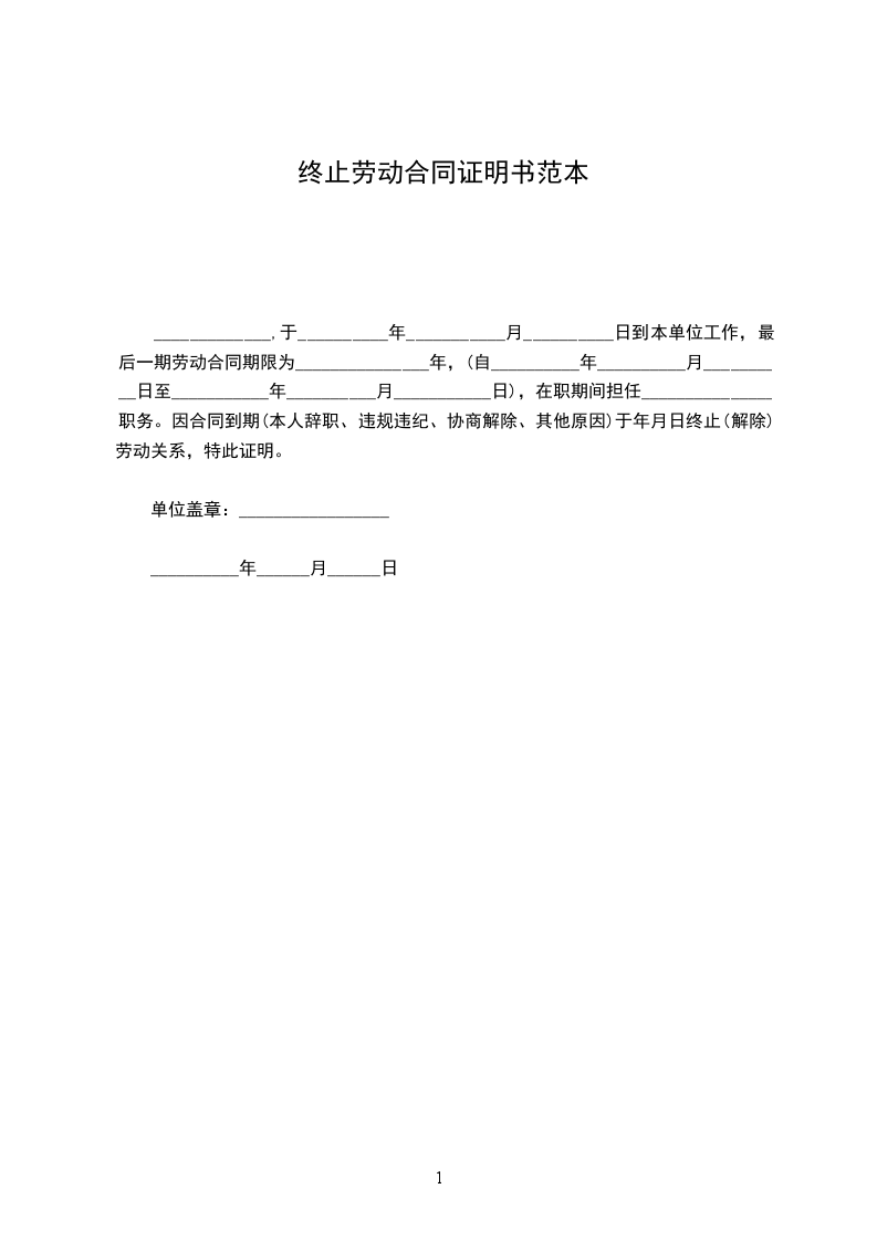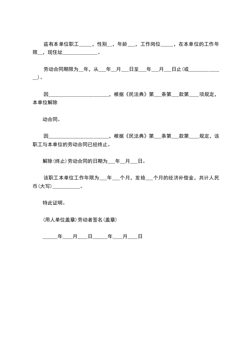 _____________,于__________年___________月__________日到本单位工作,最后一期劳动合同期限为_______________年,(自__________年__________月__________日至___________年__________月___________日),在职期间担任_______________职务。因合同到期(本人辞职、违规违纪、协商解除、其他原因)于_____年_____月_____日终止(解除)劳动关系,特此证明。