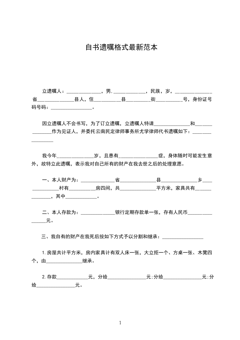 我今年_______________岁,且患有________________症,身体随时可能发生意外,故特立此遗嘱,表示我对自己所有的财产在我去世之后的处理意愿。